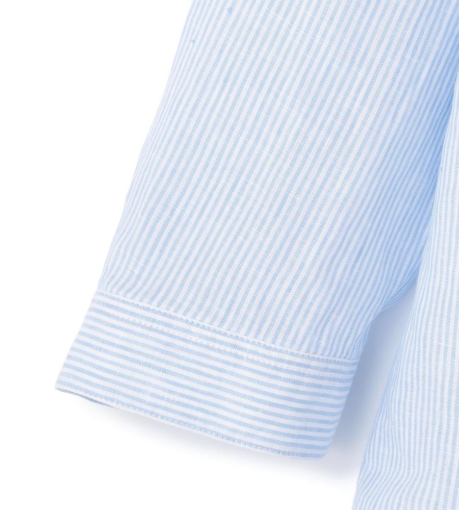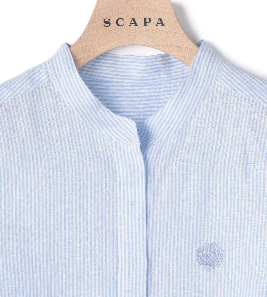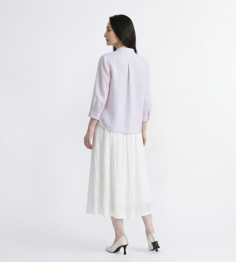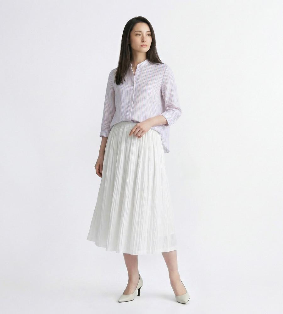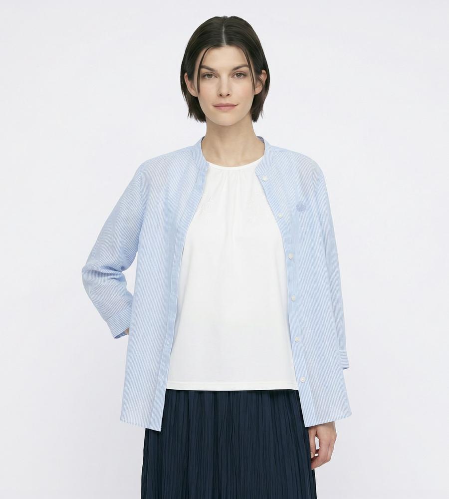 肌にさらっと心地よく着られるリネン100%素材のシャツです。これからの季節にぴったりの爽やかなストライプ柄、顔まわりをすっきりと見せてくれるバンドカラーで仕上げました。1枚着はもちろんボタンを開けて羽織りとしてあわせるのもおすすめ、ロングシーズンお使いいただける7分袖もポイントです。
