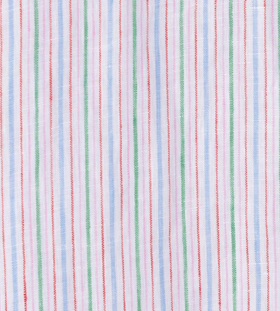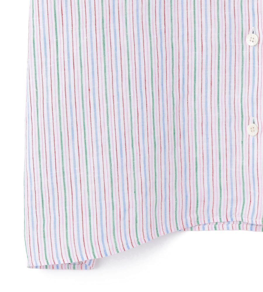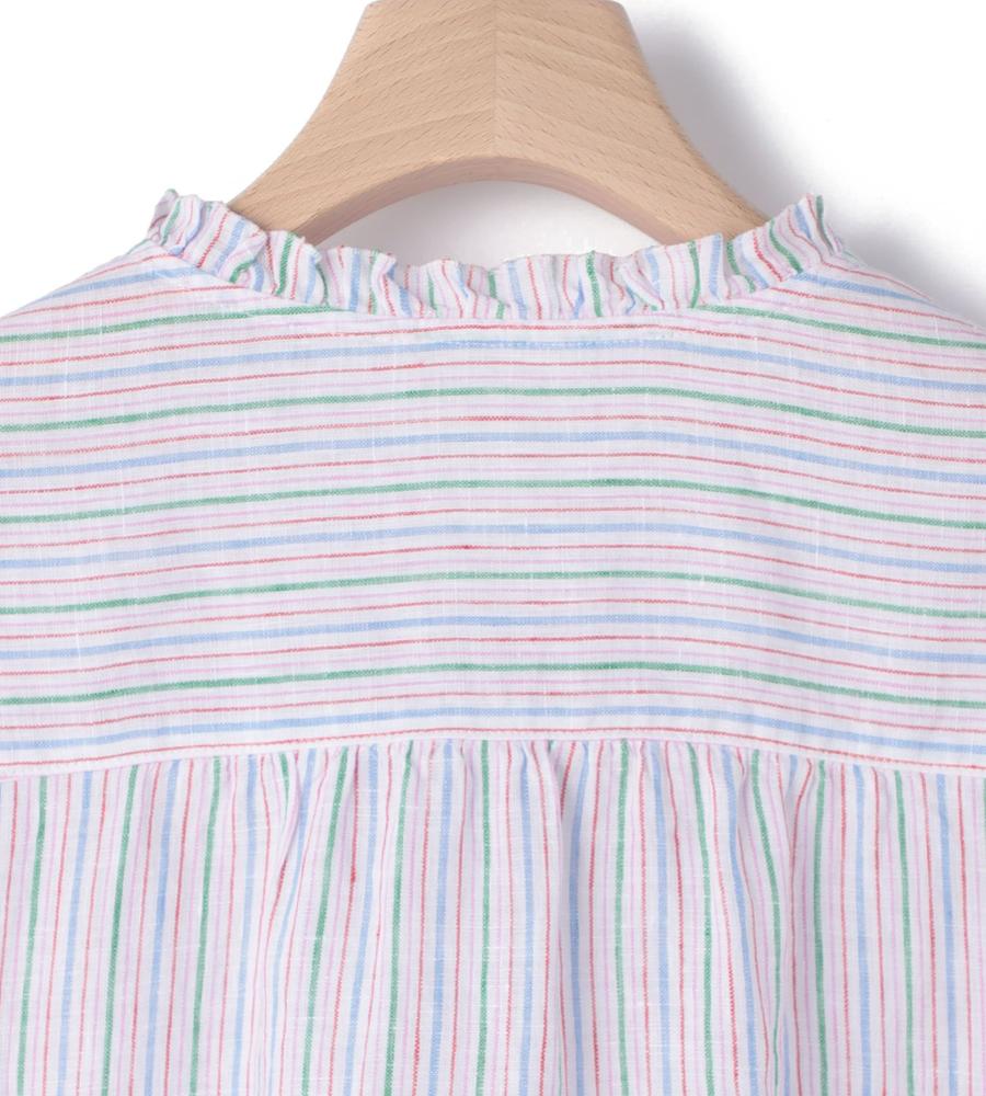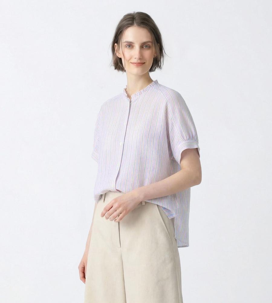 肌にさらっと心地よく着られるリネン100%素材のブラウスです。これからの季節にぴったりの爽やかなストライプ柄、顔まわりをすっきりと見せてくれるバンドカラーはフリルで大人可愛くおめかししました。ふんわりボリューム感を持たせた袖もポイント、ワンピースやジャンスカのインナーとしてもおすすめです。