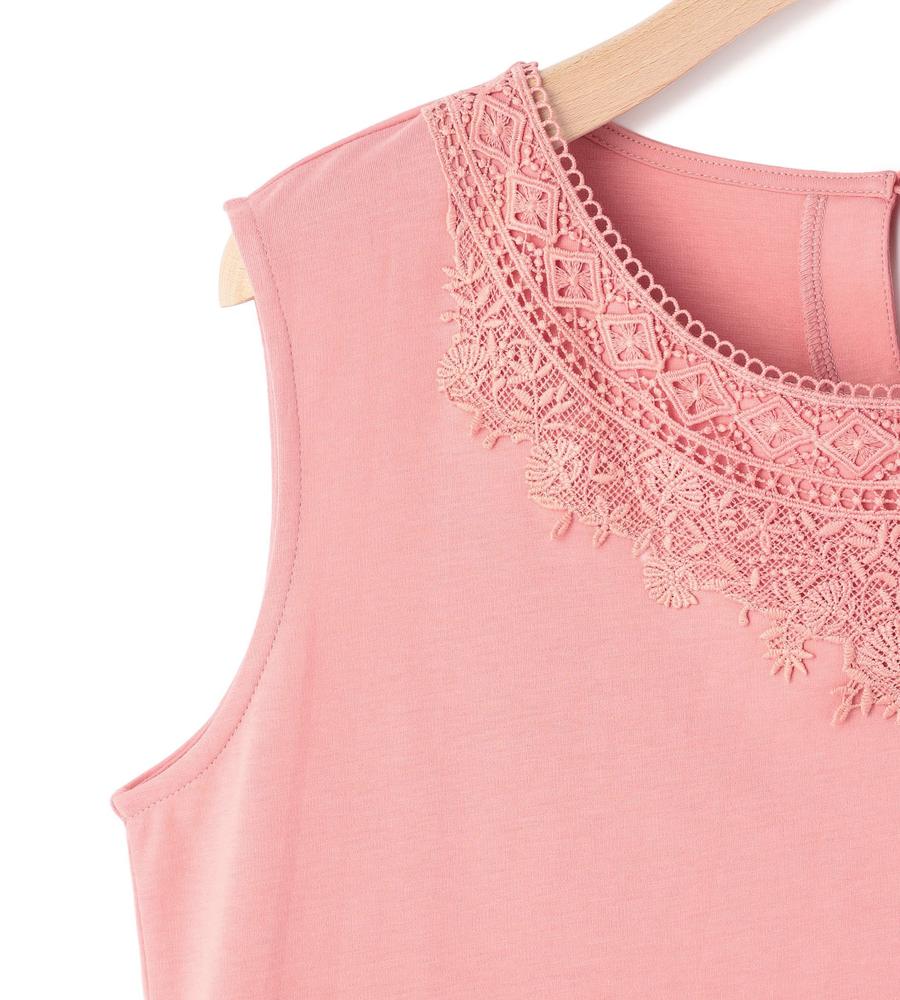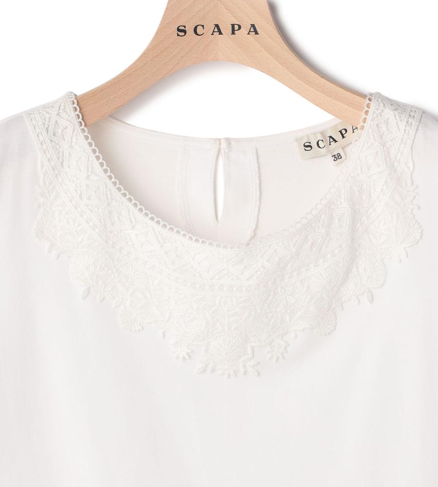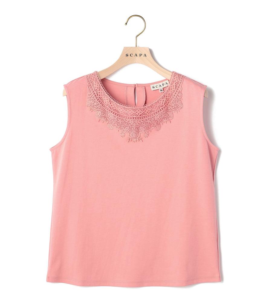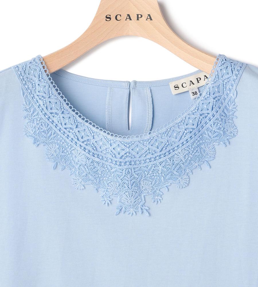 レース使いが華やかなカットソー。広めのラウンドネックでデコルテをきれいに見せる一方、アームホールはコンパクトにつめて1枚でも着やすく調整しています。綿100%のジャージー素材を使用しており、柔らかくやさしい着心地。あらゆるボトムスに合わせやすく、カジュアルにもエレガントにも着こなせます。