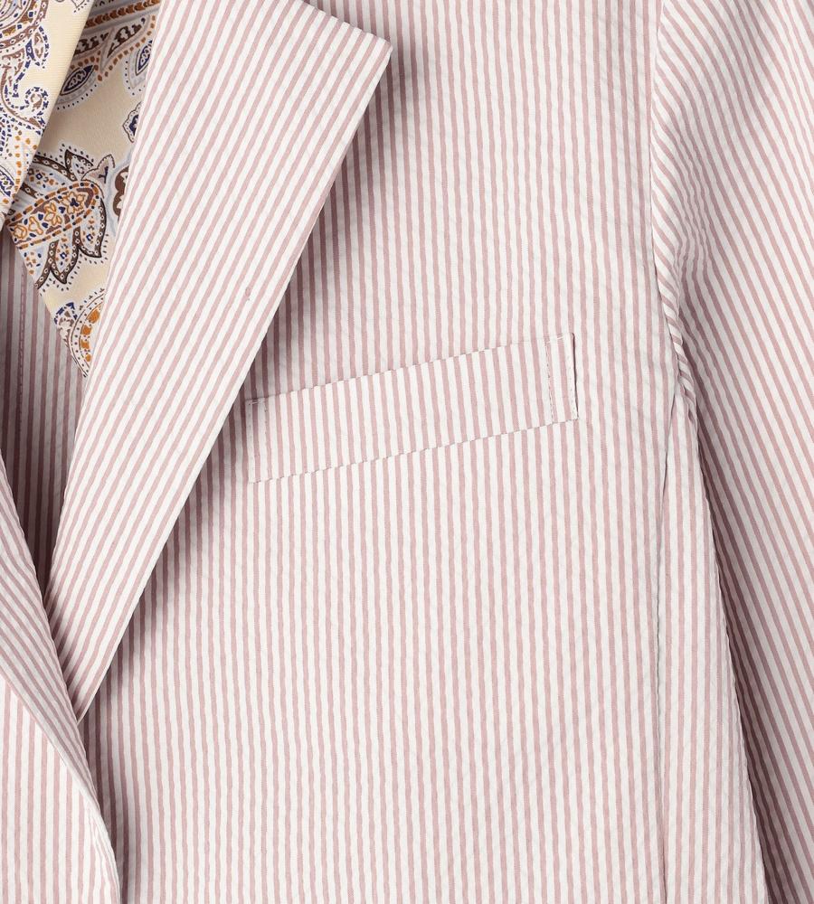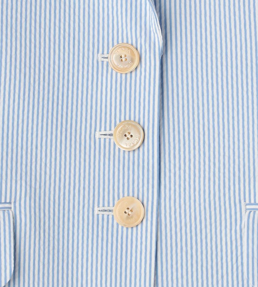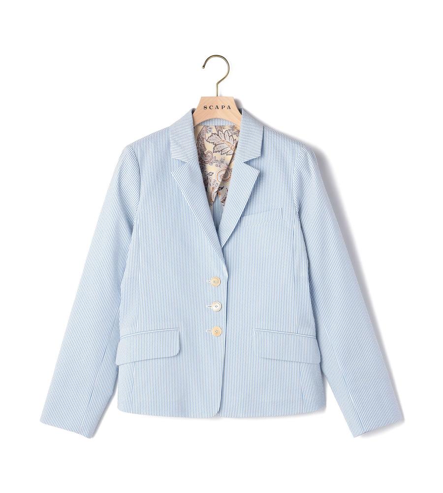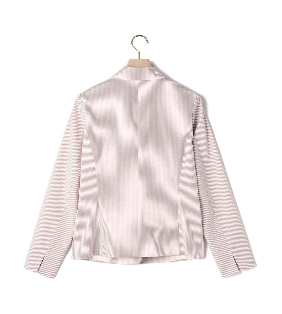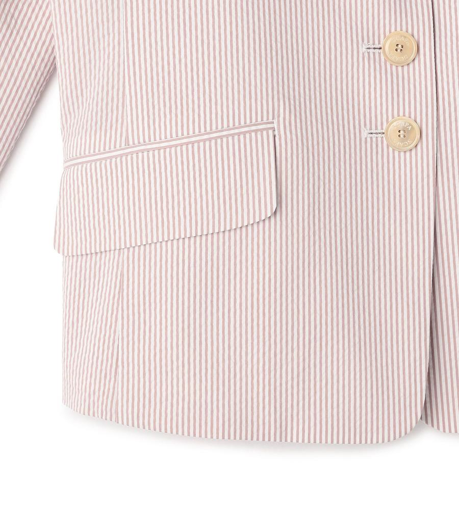 爽やかなスタイリングがかなう、これからの季節にぴったりなサッカーストライプ柄のジャケットです。ウエストを絞ったシルエットで女性らしさをプラス、袖は折り返しても着られるデザインに仕上げました。手持ちのアイテムとはもちろん、同柄のワンピースやパンツとセットでそろえるのもおすすめです。