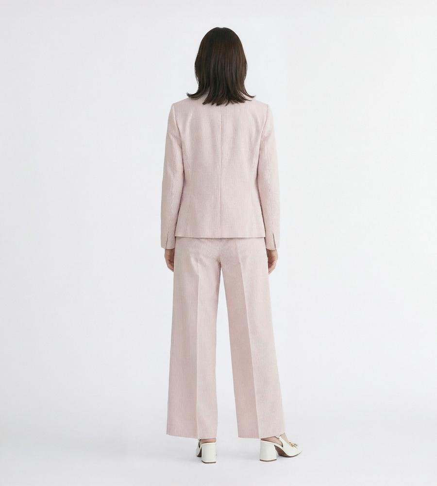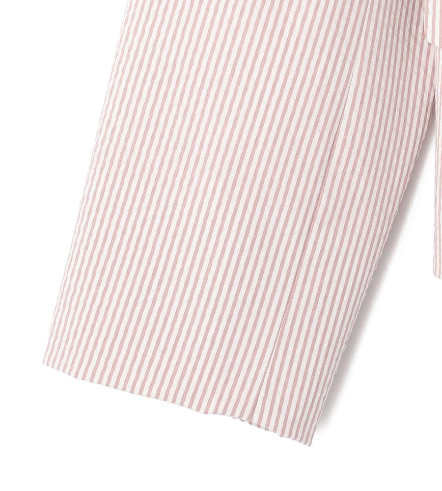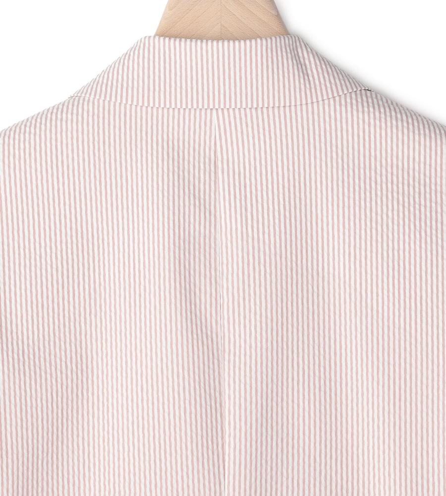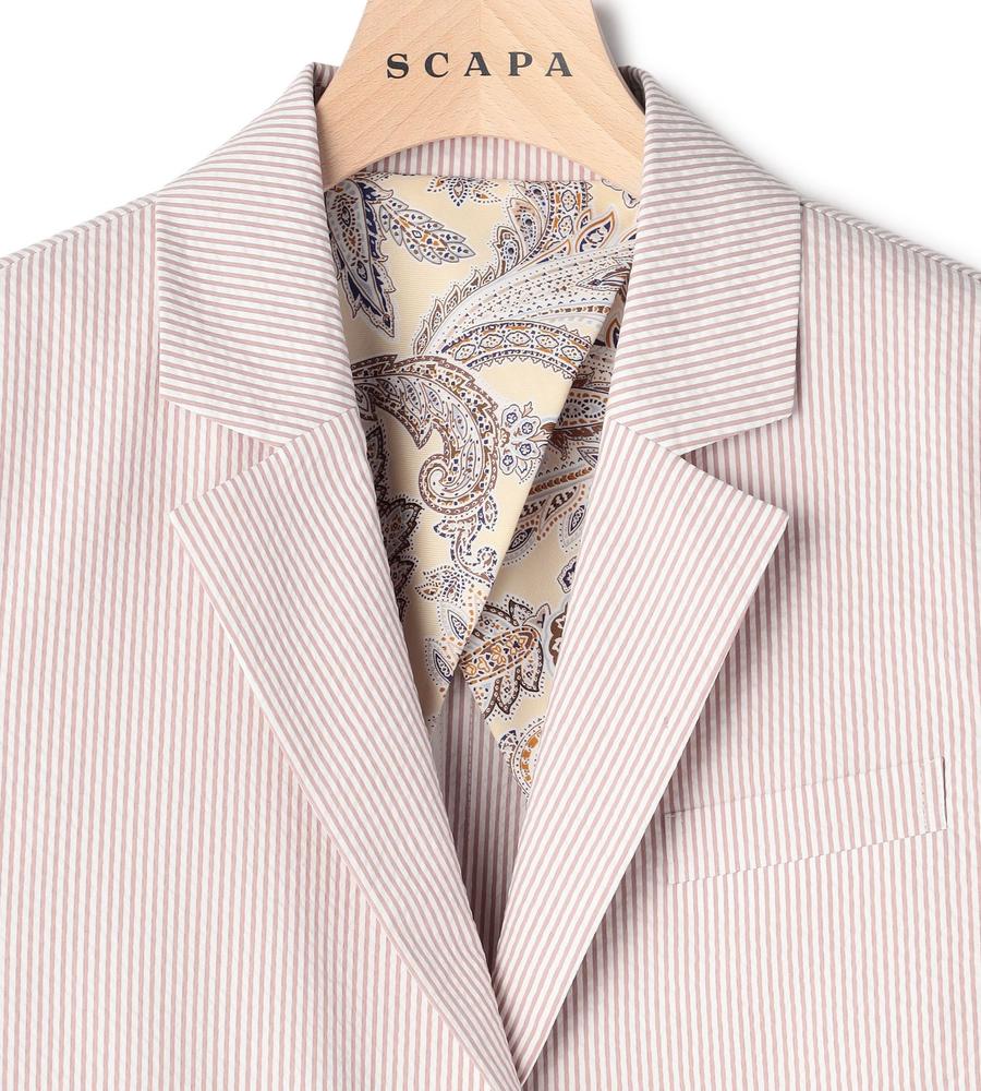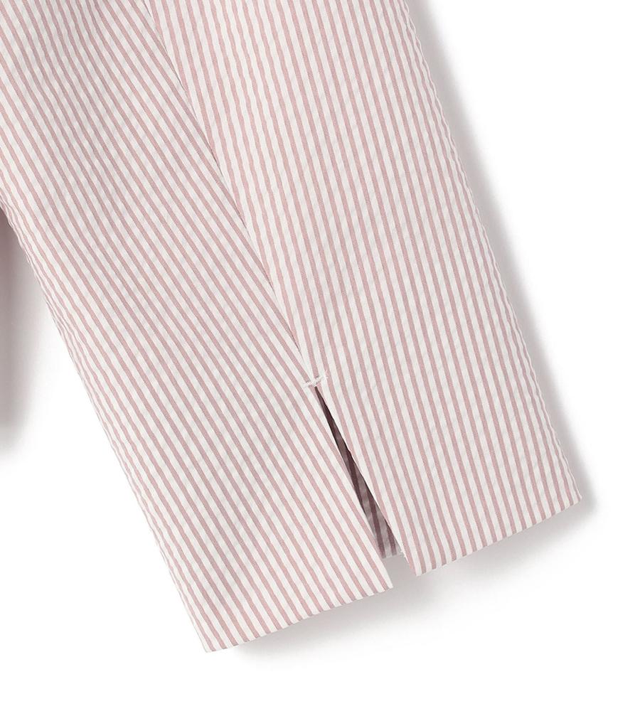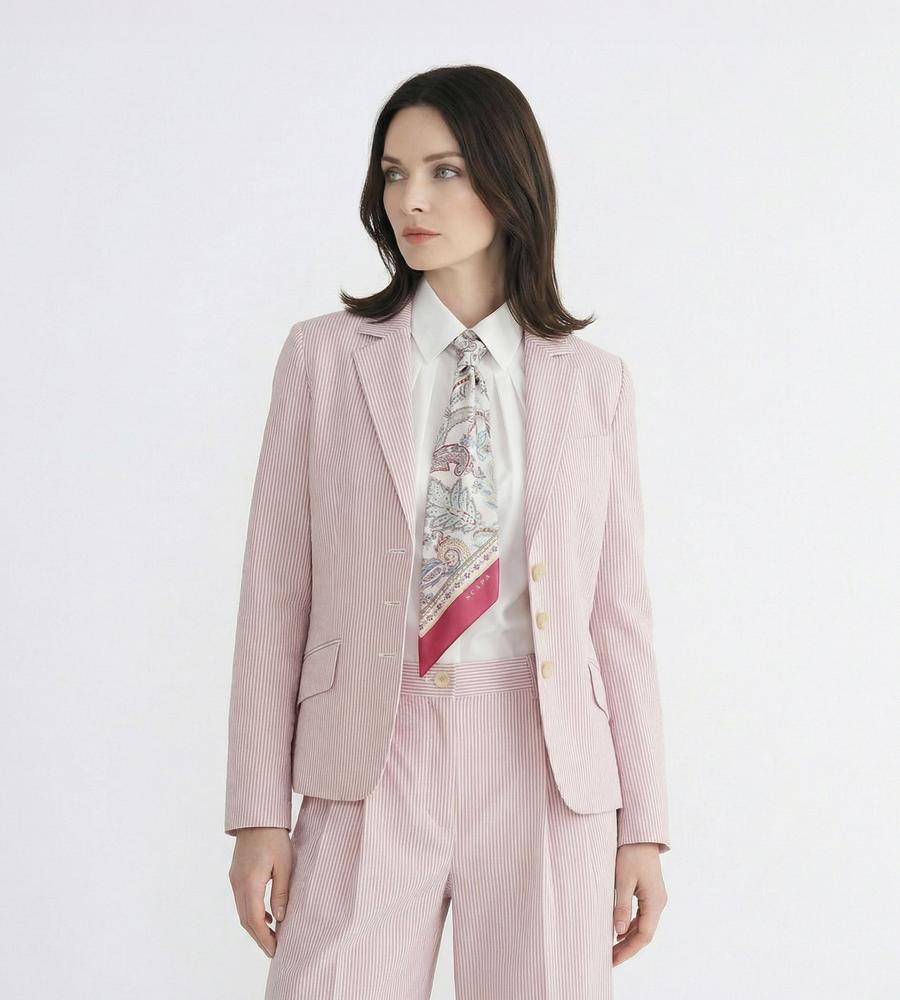 爽やかなスタイリングがかなう、これからの季節にぴったりなサッカーストライプ柄のジャケットです。ウエストを絞ったシルエットで女性らしさをプラス、袖は折り返しても着られるデザインに仕上げました。手持ちのアイテムとはもちろん、同柄のワンピースやパンツとセットでそろえるのもおすすめです。