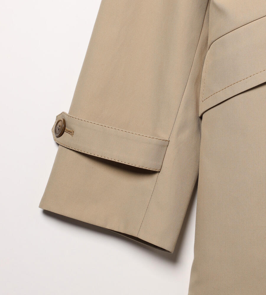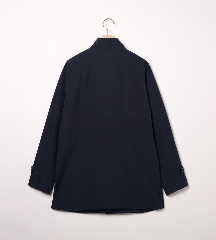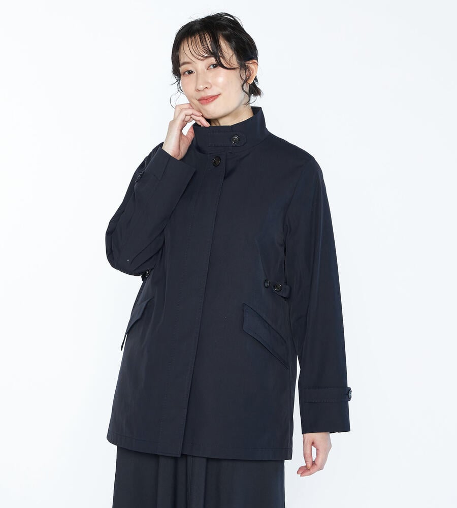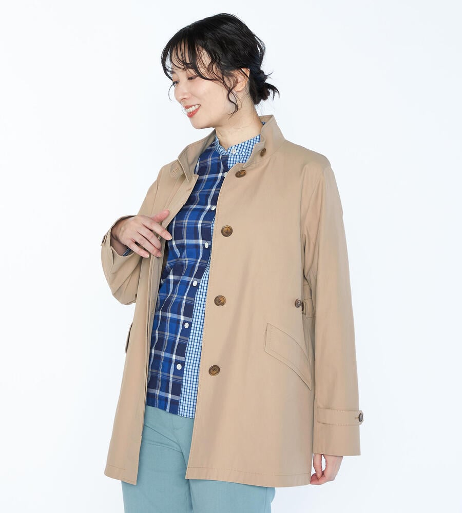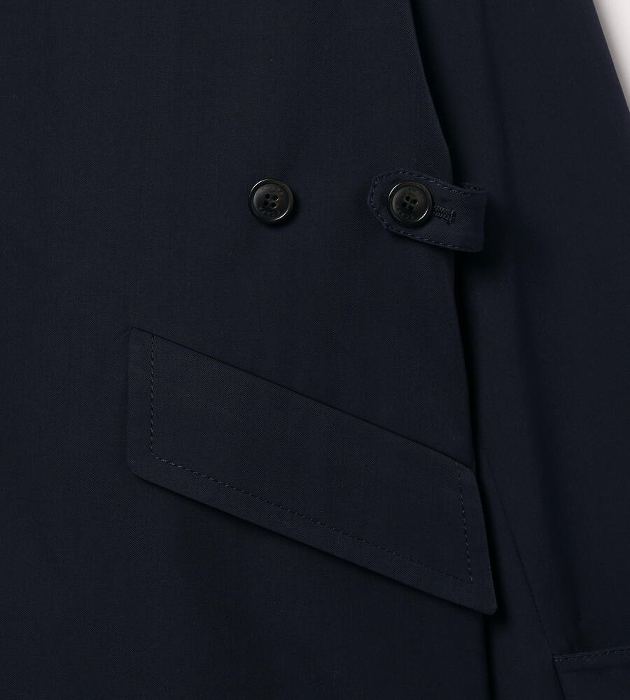 トラディショナルな雰囲気を醸しつつもモダンなエッセンスをプラスしたミドル丈コート。左右にフラップポケットを配置。ウエストサイドのボタン×ベルトディテールが腰位置を高く見せグッドバランスに。ポリエステルとコットンをブレンドしたシルキーシャンブレー素材を採用しています。