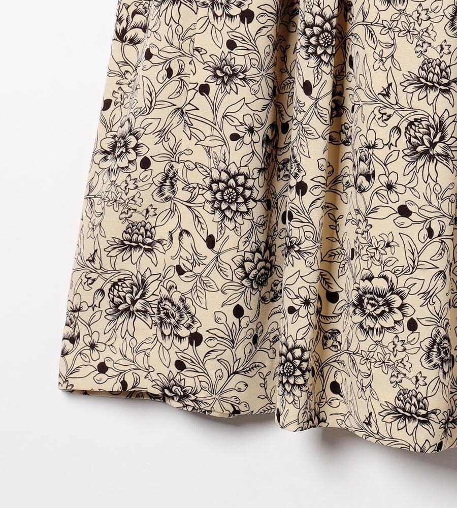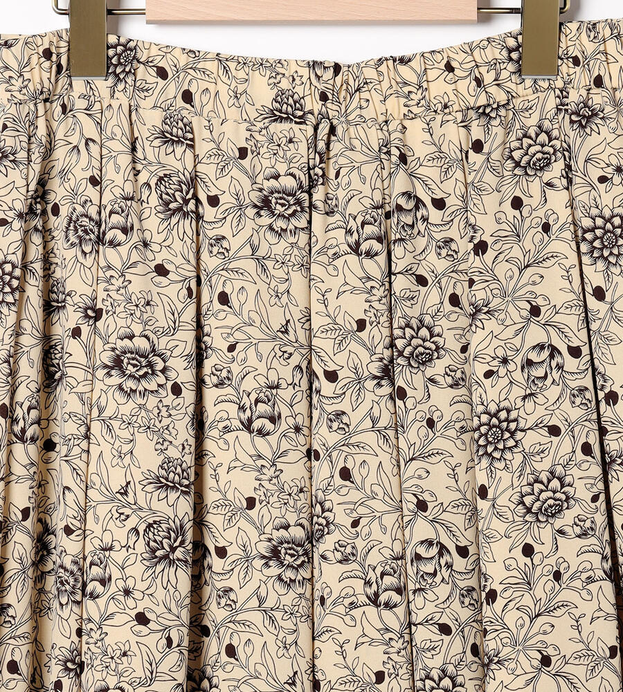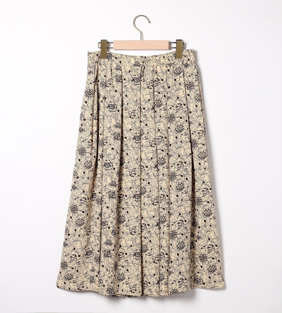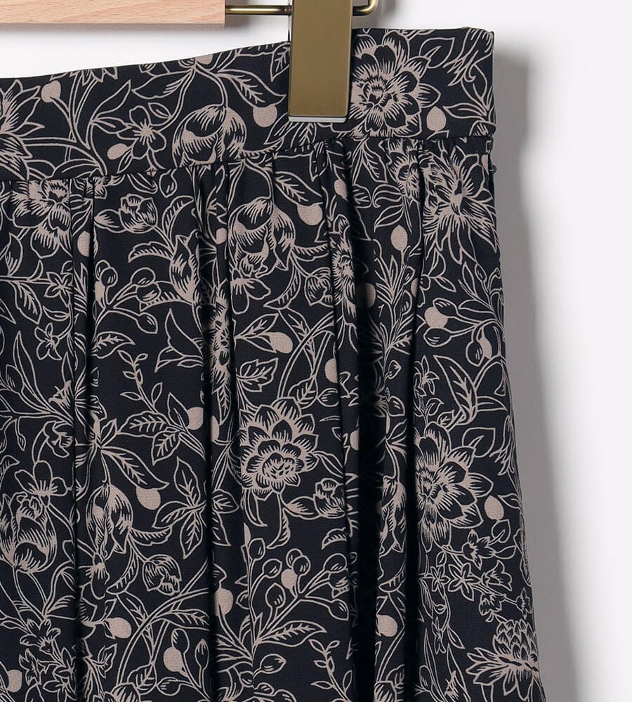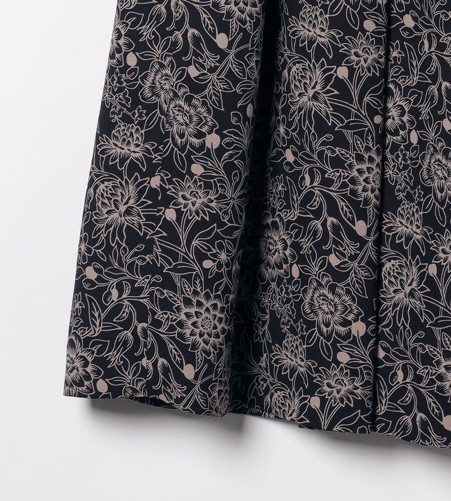 緻密な線画タッチのフラワープリントで仕立てたスカート。タック×ギャザーで程よいフレア感を持たせたシルエットが女性らしく華やかな印象です。シックな配色とロング丈で上品に穿きこなせるのもポイント。しなやかな風合いのポリエステル生地を使用しており、揺れ感やドレープがきれいに出るのも特徴です。