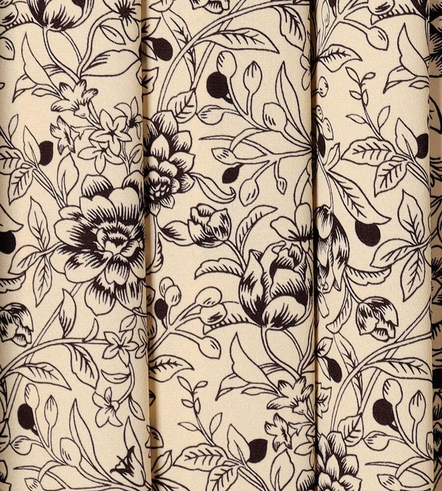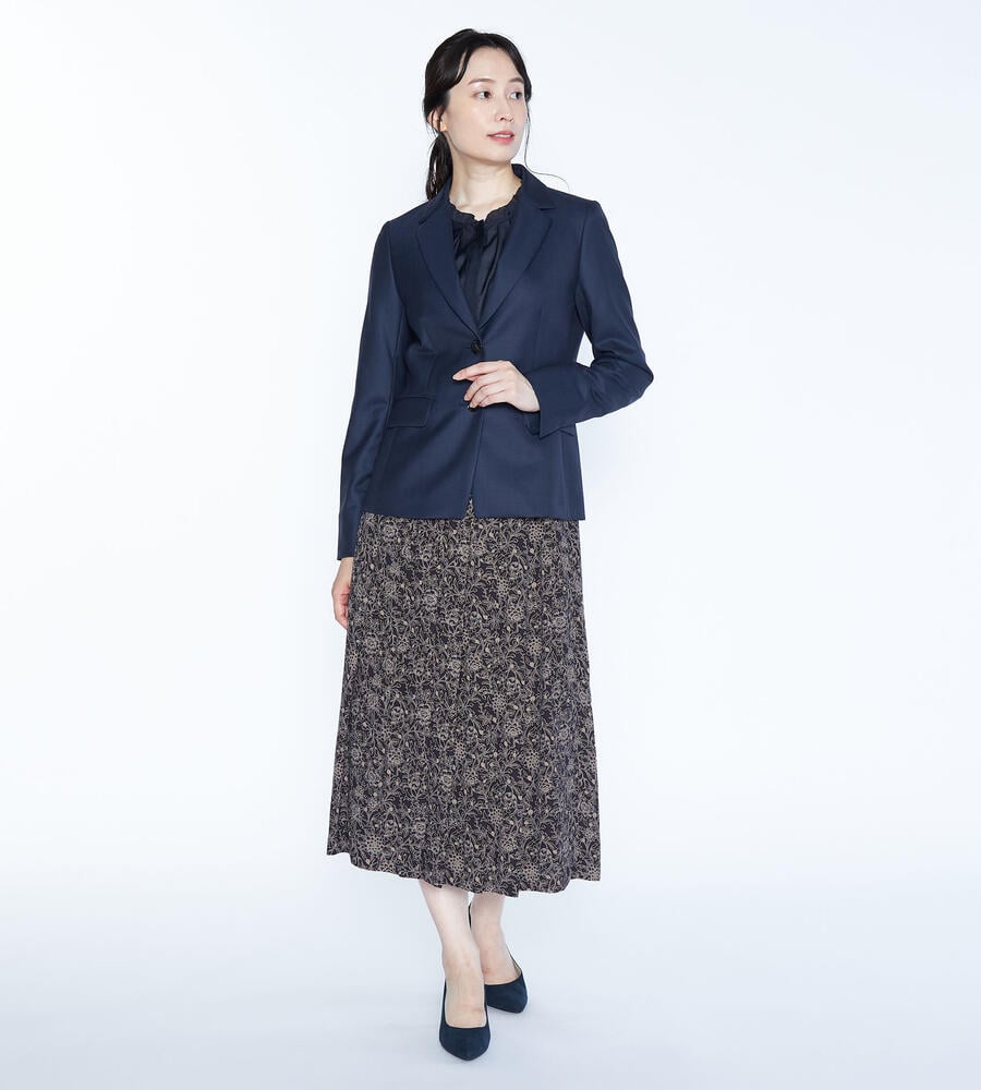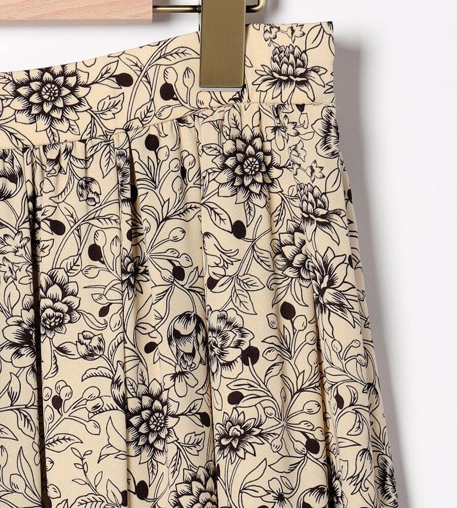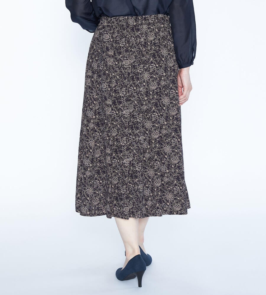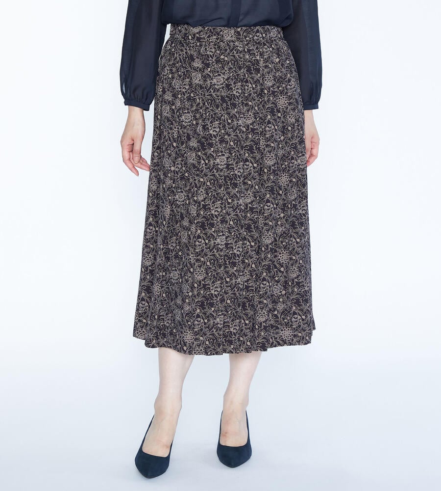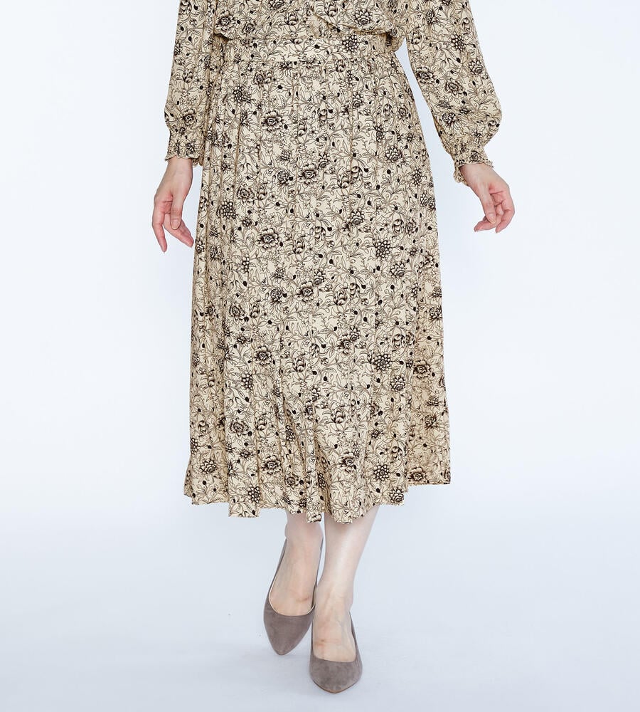 緻密な線画タッチのフラワープリントで仕立てたスカート。タック×ギャザーで程よいフレア感を持たせたシルエットが女性らしく華やかな印象です。シックな配色とロング丈で上品に穿きこなせるのもポイント。しなやかな風合いのポリエステル生地を使用しており、揺れ感やドレープがきれいに出るのも特徴です。
