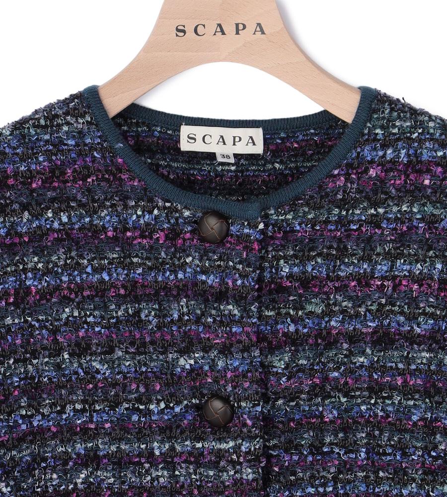 厳選された素材にこだわるスキャパらしさを堪能できる、上質なツイード生地を採用したニットです。トリミングやボタンがポイントになるデザイン。コンパクトなシルエットでボトムとバランスを取りやすく、カーディガン感覚で羽織ることができます。美意識の高い色合わせのミックスヤーンが魅力的な1着です。