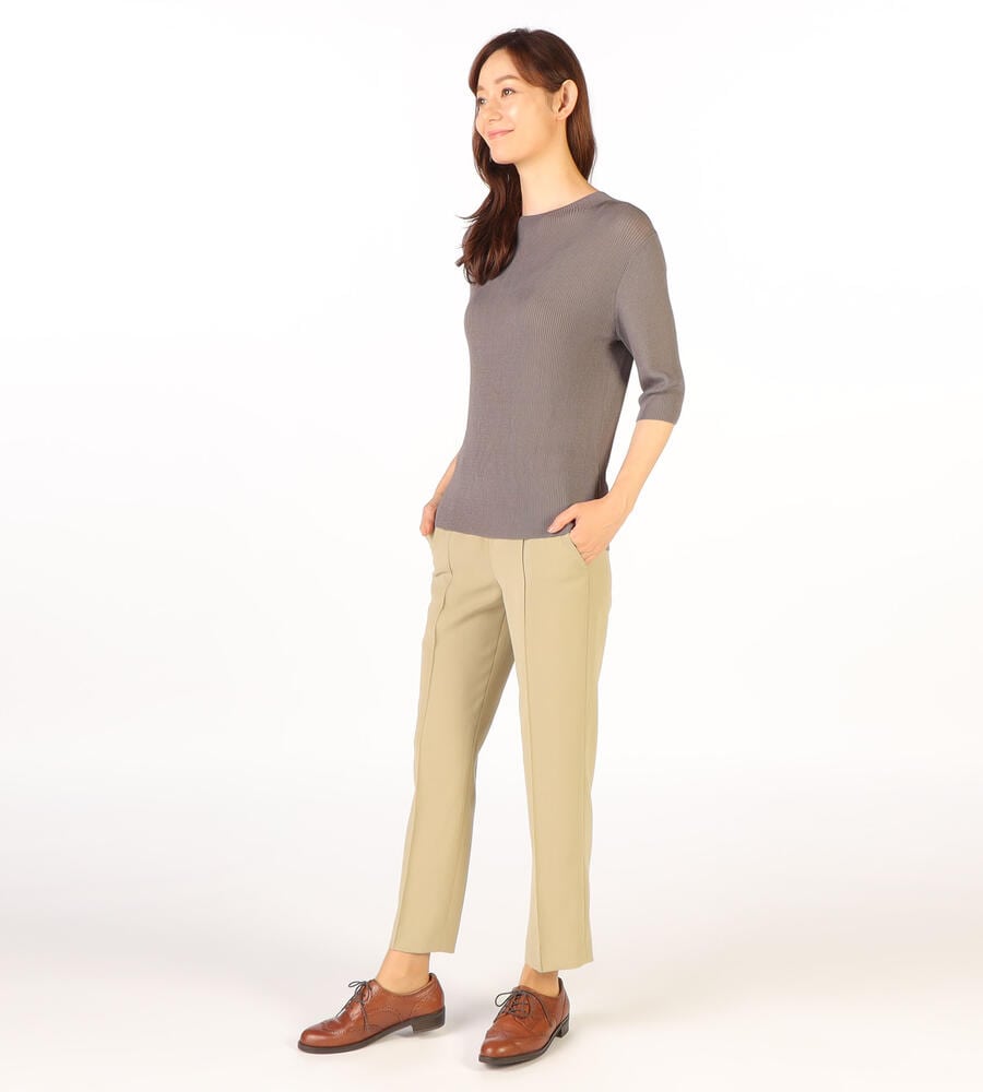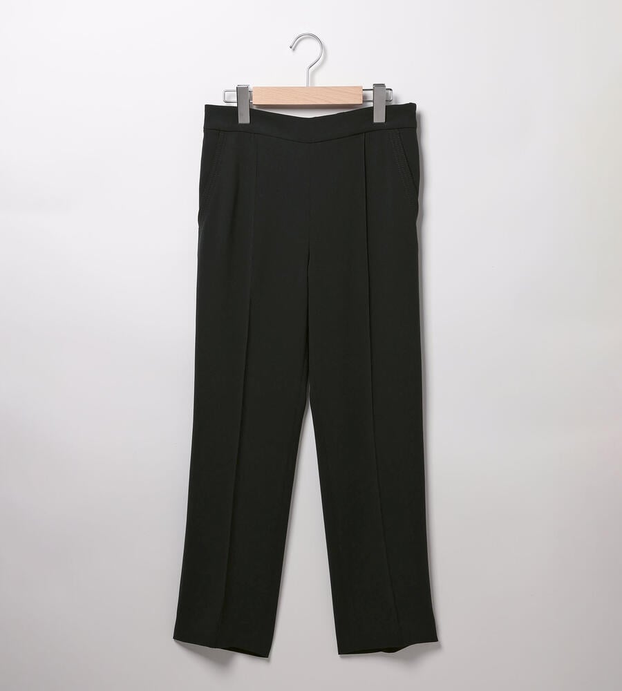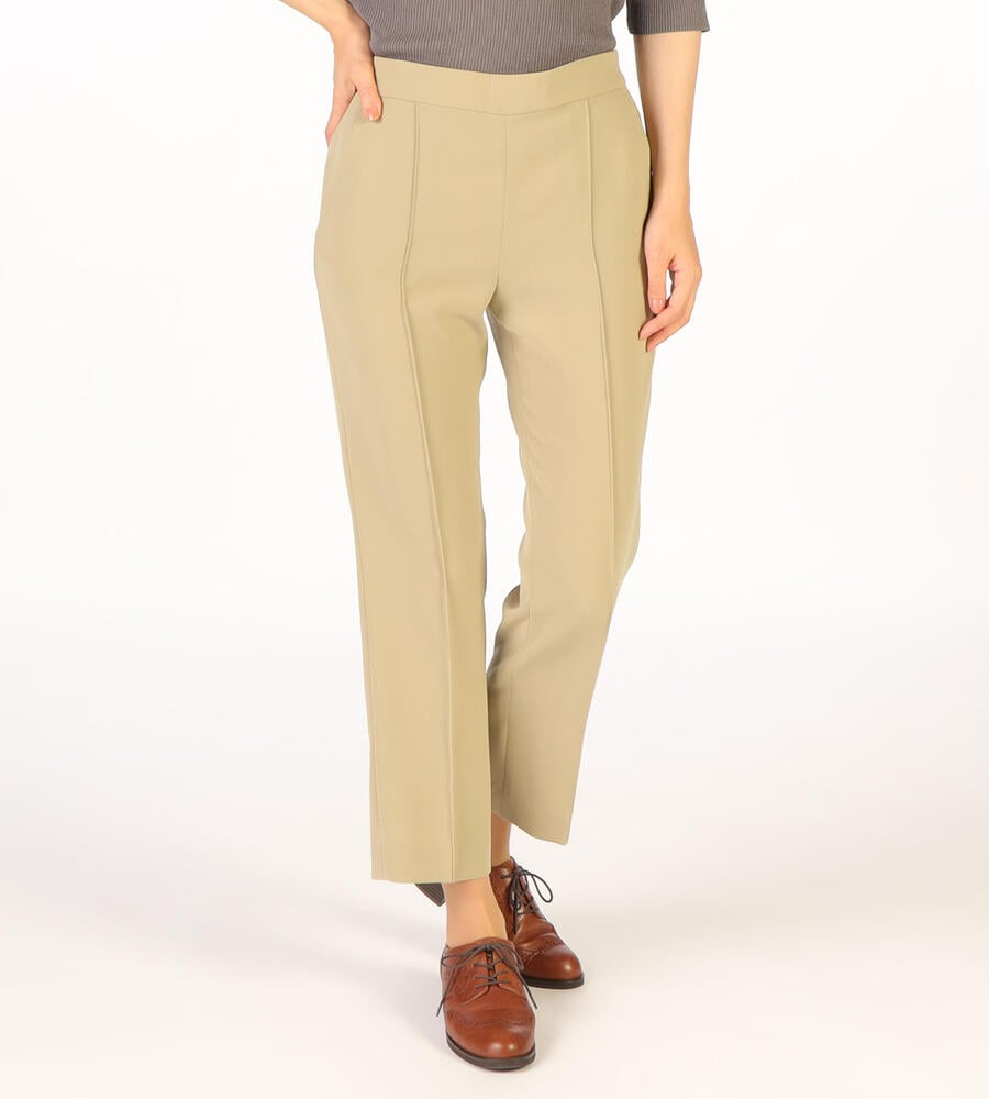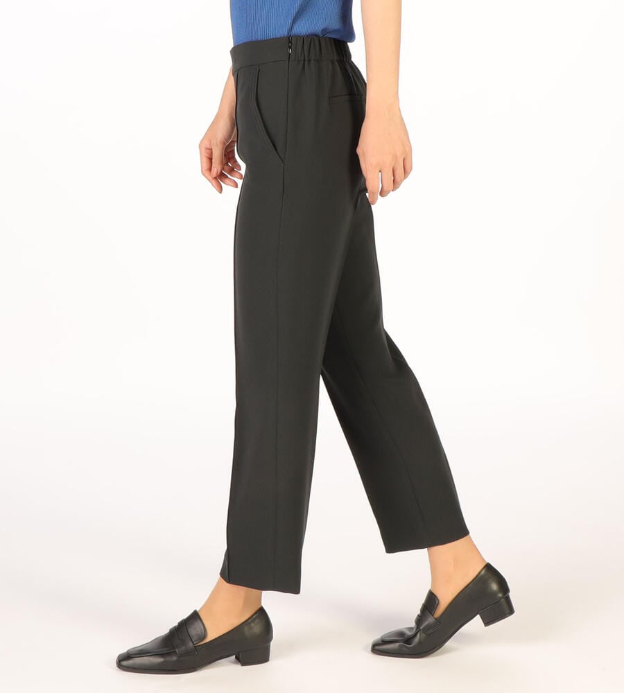 さらっとなめらかな肌触りのドライストレッチ生地で仕立てたパンツ。くるぶしののぞく軽やかなアンクル丈。ストレッチ性があるので、身体の動きに合わせて伸縮する快適な履き心地の生地感が魅力。センターラインのデザインで、エレガントでシックなムードを演出。オンオフ問わず活躍する汎用性抜群のアイテムです。