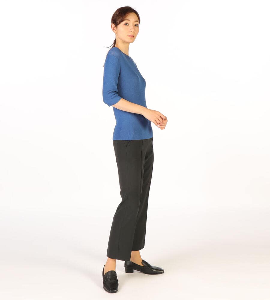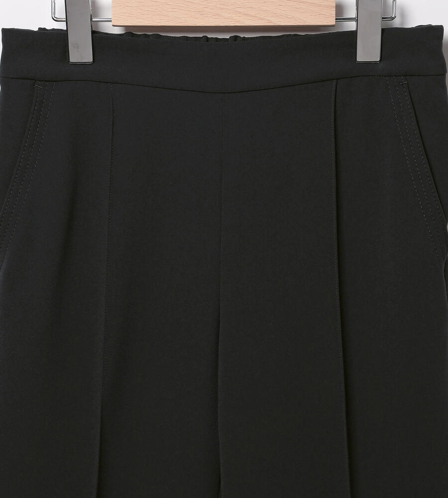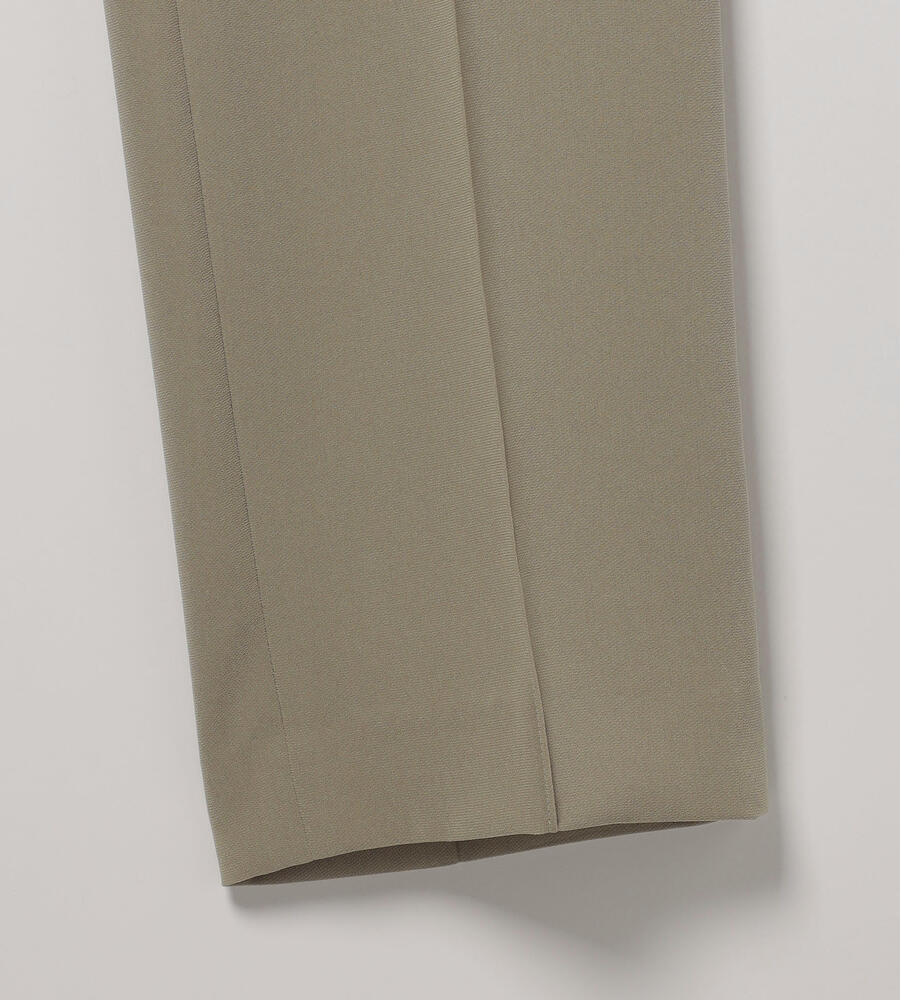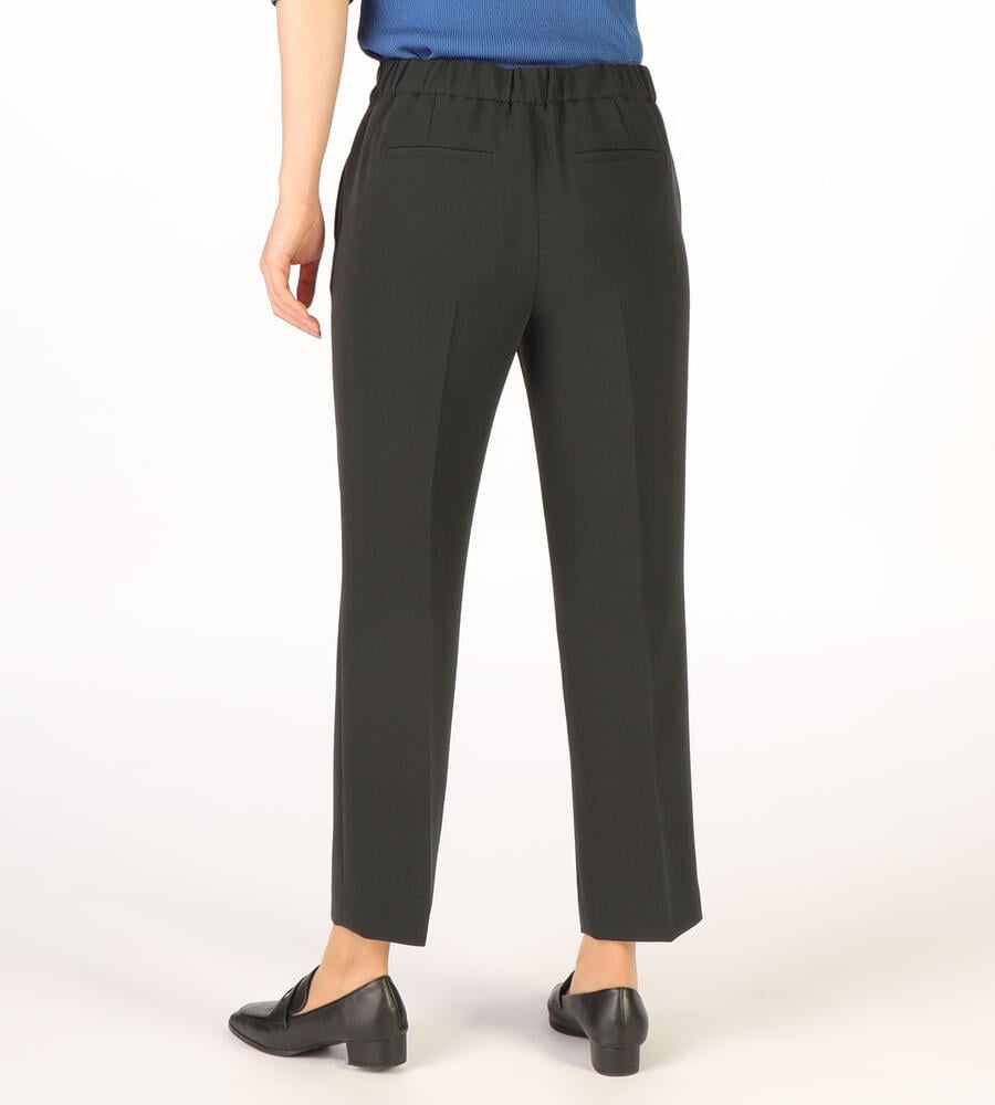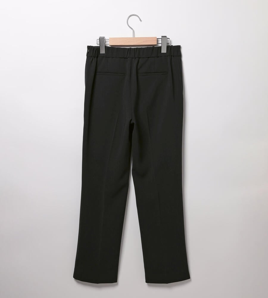 さらっとなめらかな肌触りのドライストレッチ生地で仕立てたパンツ。くるぶしののぞく軽やかなアンクル丈。ストレッチ性があるので、身体の動きに合わせて伸縮する快適な履き心地の生地感が魅力。センターラインのデザインで、エレガントでシックなムードを演出。オンオフ問わず活躍する汎用性抜群のアイテムです。