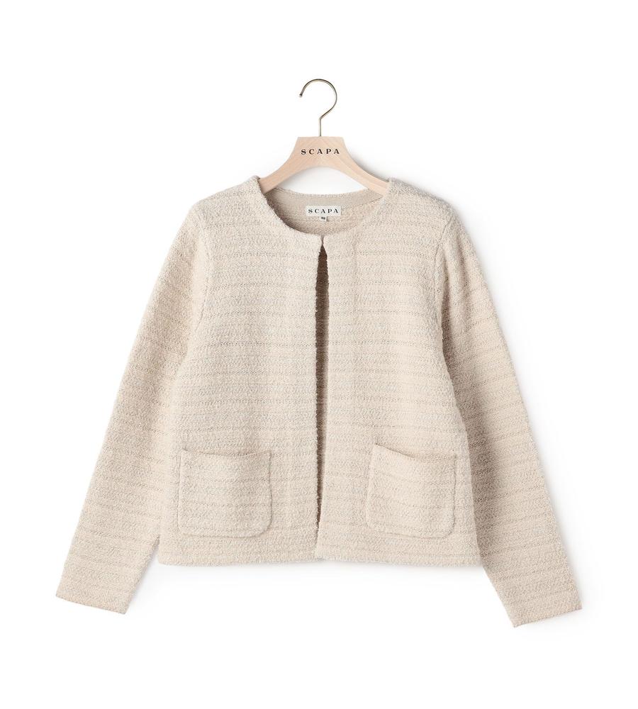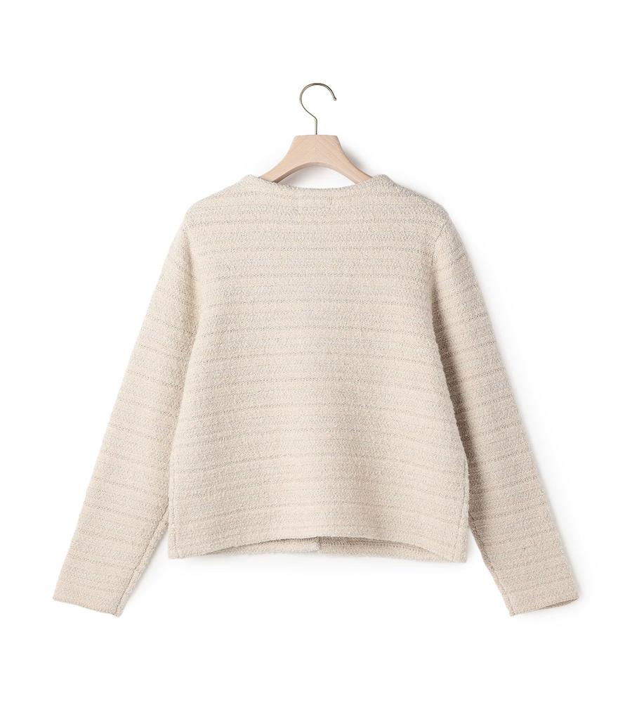 ファンシーヤーンで仕立てたエレガントな長袖ニットカーディガン。軽やかなムードで着こなしやすいカノコ編み。フロントの両ポケットがおしゃれなデザインアクセント。ボタンのないすっきりとしたデザインで、様々なスタイルにフィットします。お出かけからフォーマルなシーンまで幅広く活躍するアイテムです。
