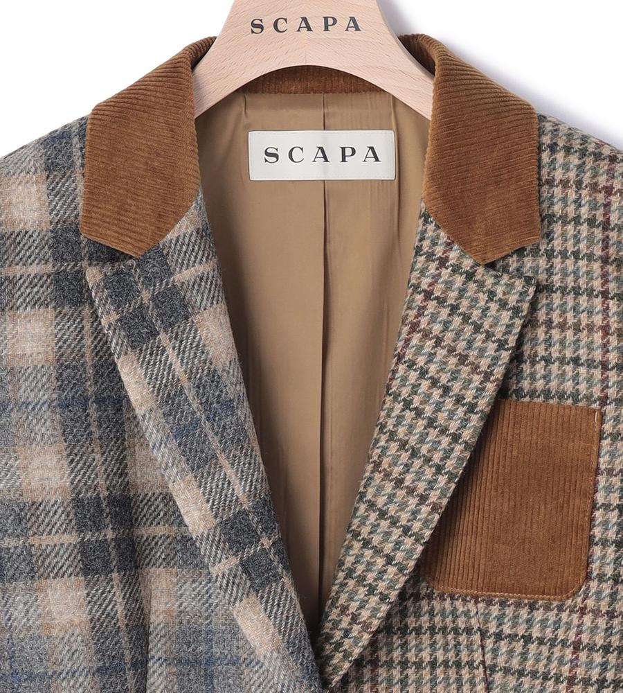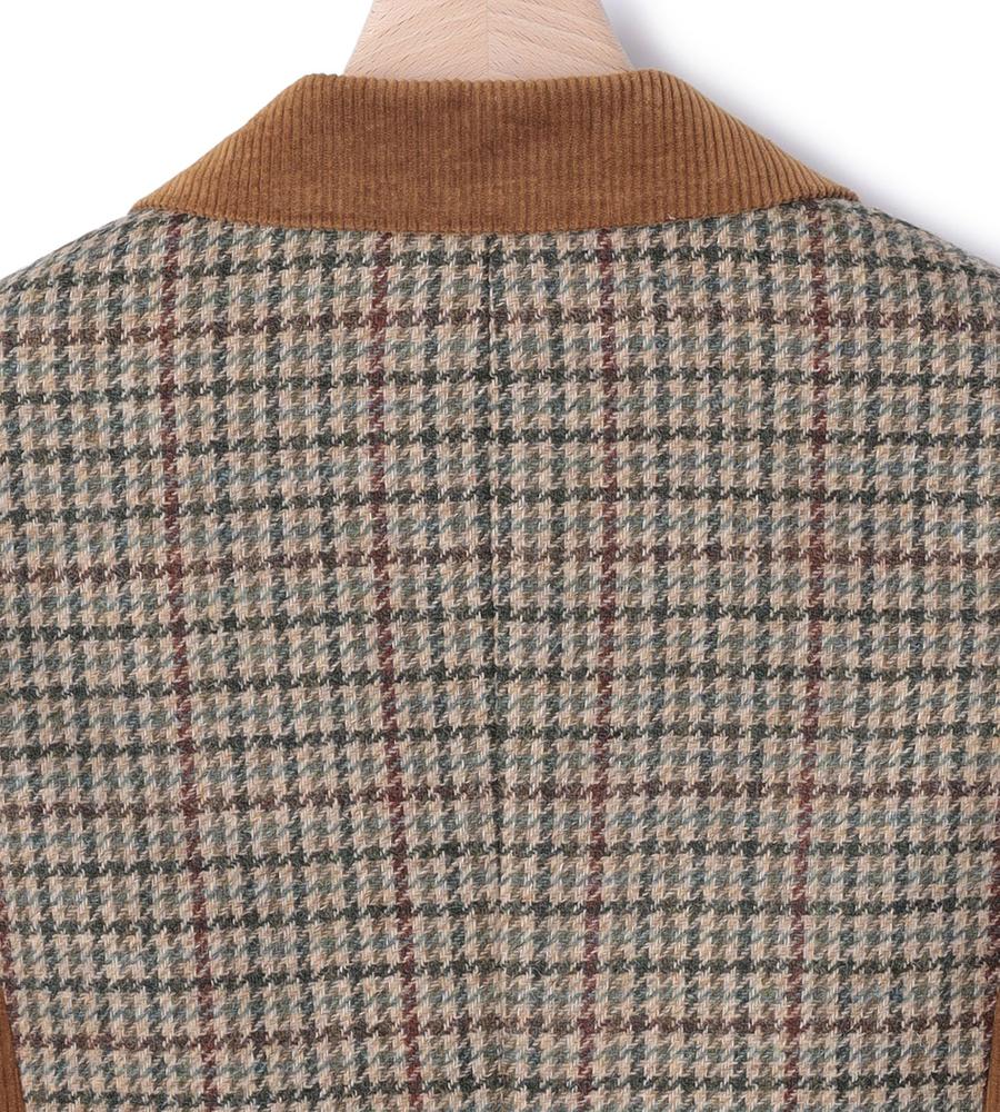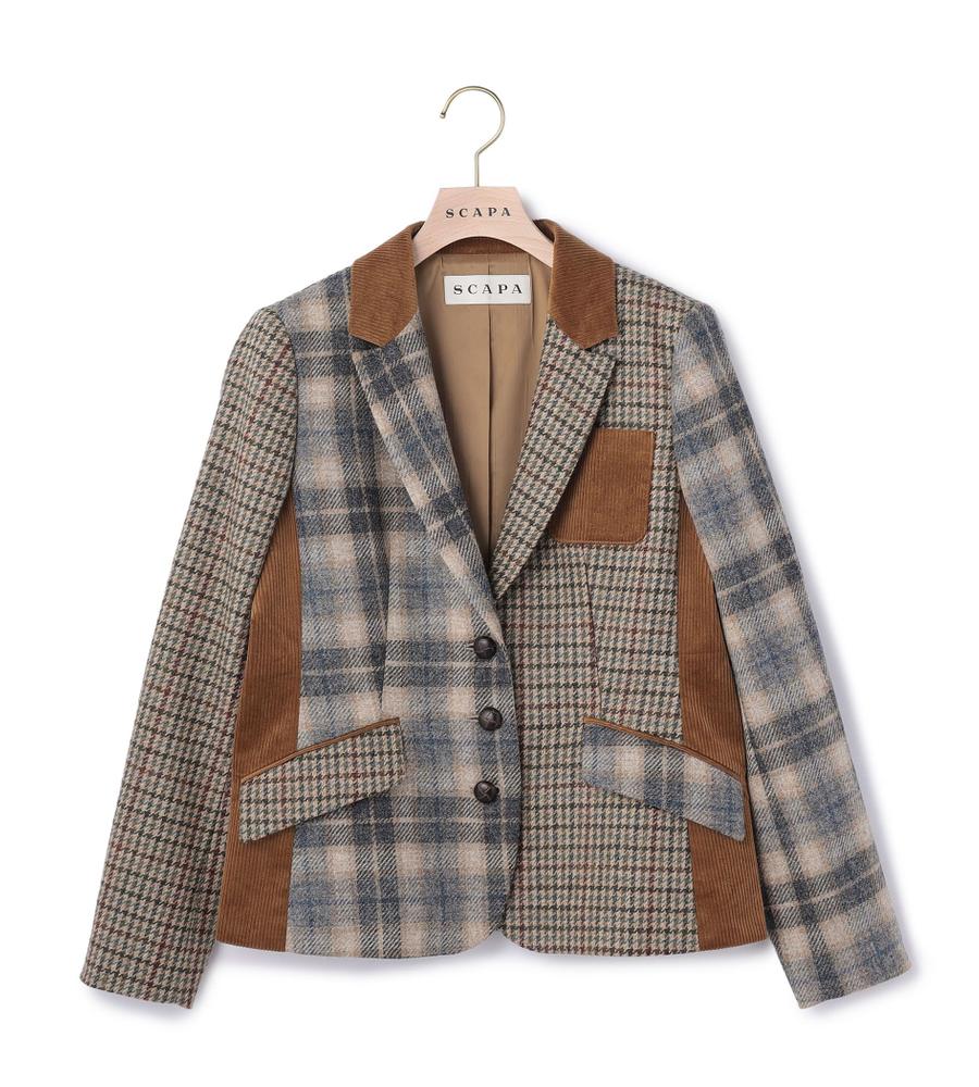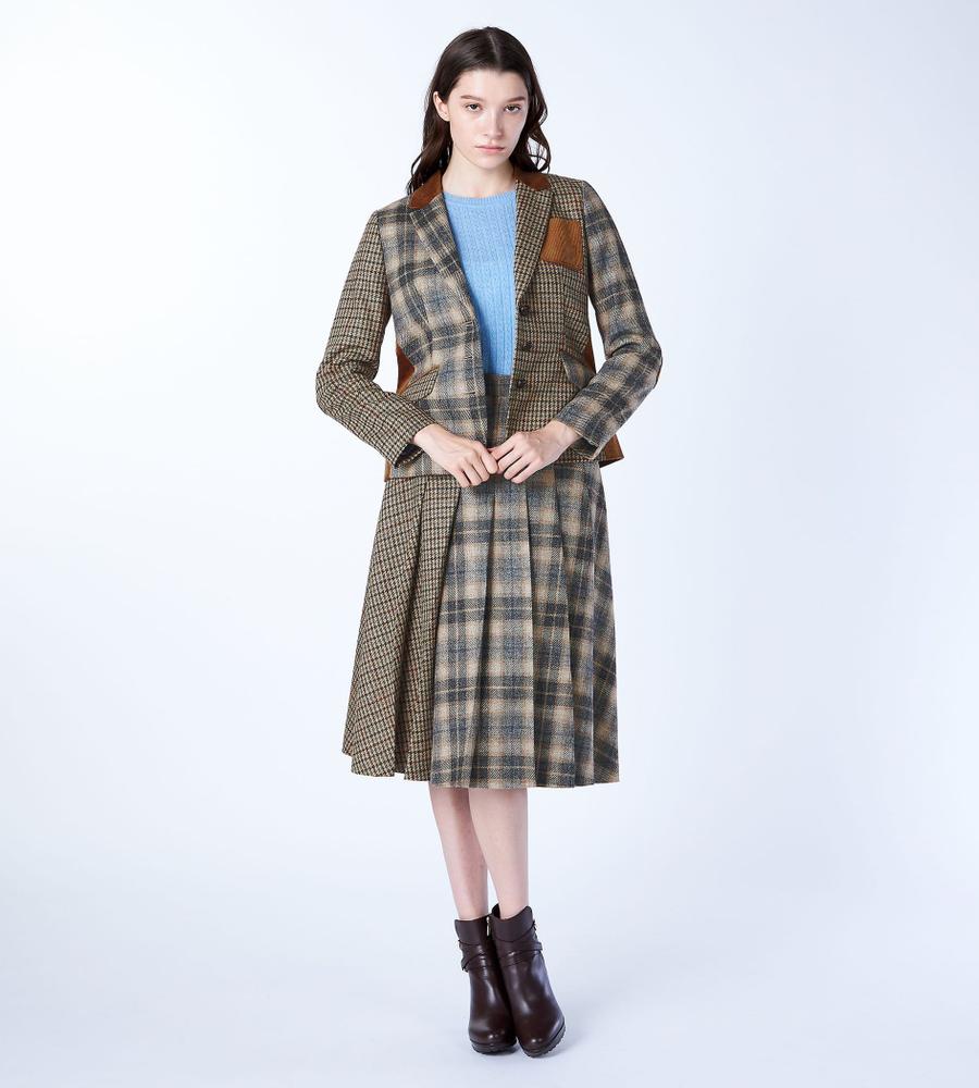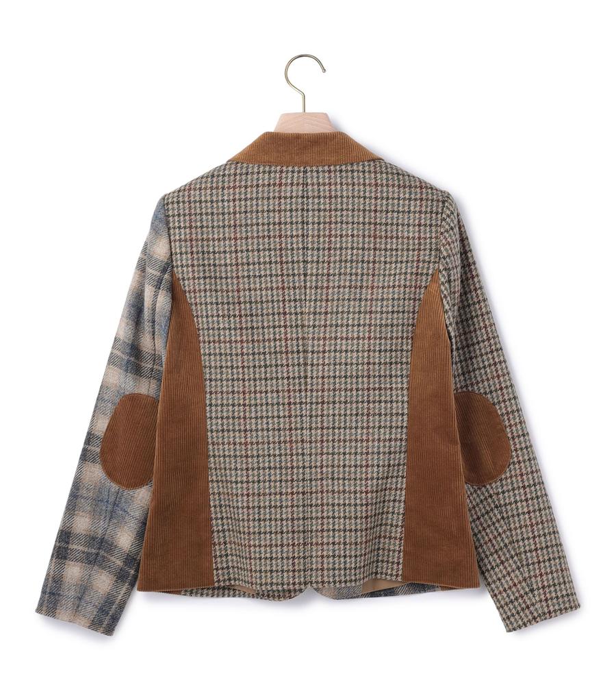 異素材で切り替えた、クレイジーパターンのテーラードジャケットです。2種類のチェック柄に、暖かみのあるコーデュロイもプラスしました。腰ポケットはフラップ付きで、左胸には丸みのあるポケットをプラス。味わいのあるレザー調のボタンもポイントです。同シリーズのプリーツスカートと、セットアップで着用ができます。