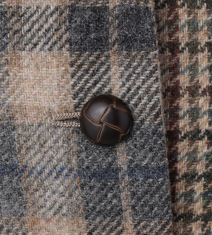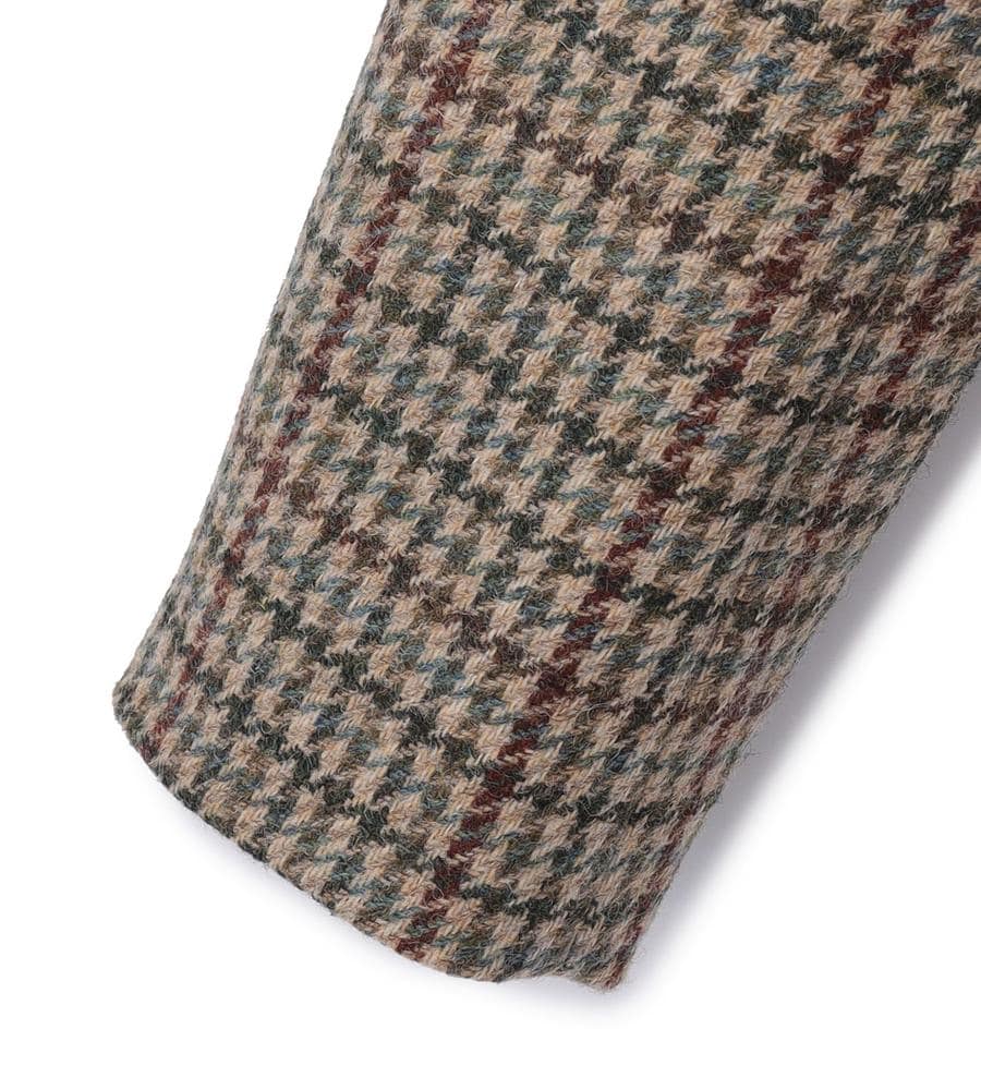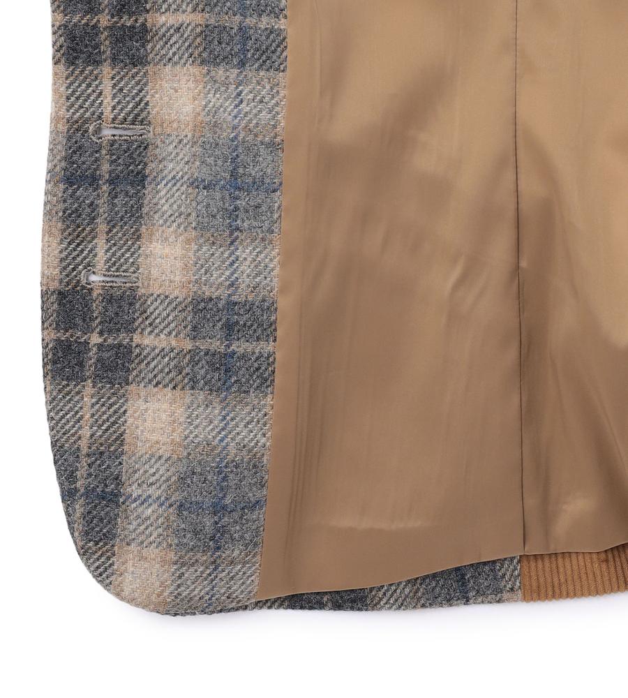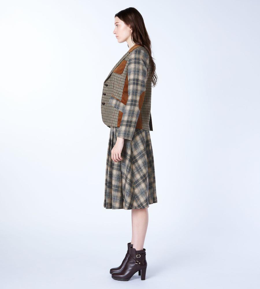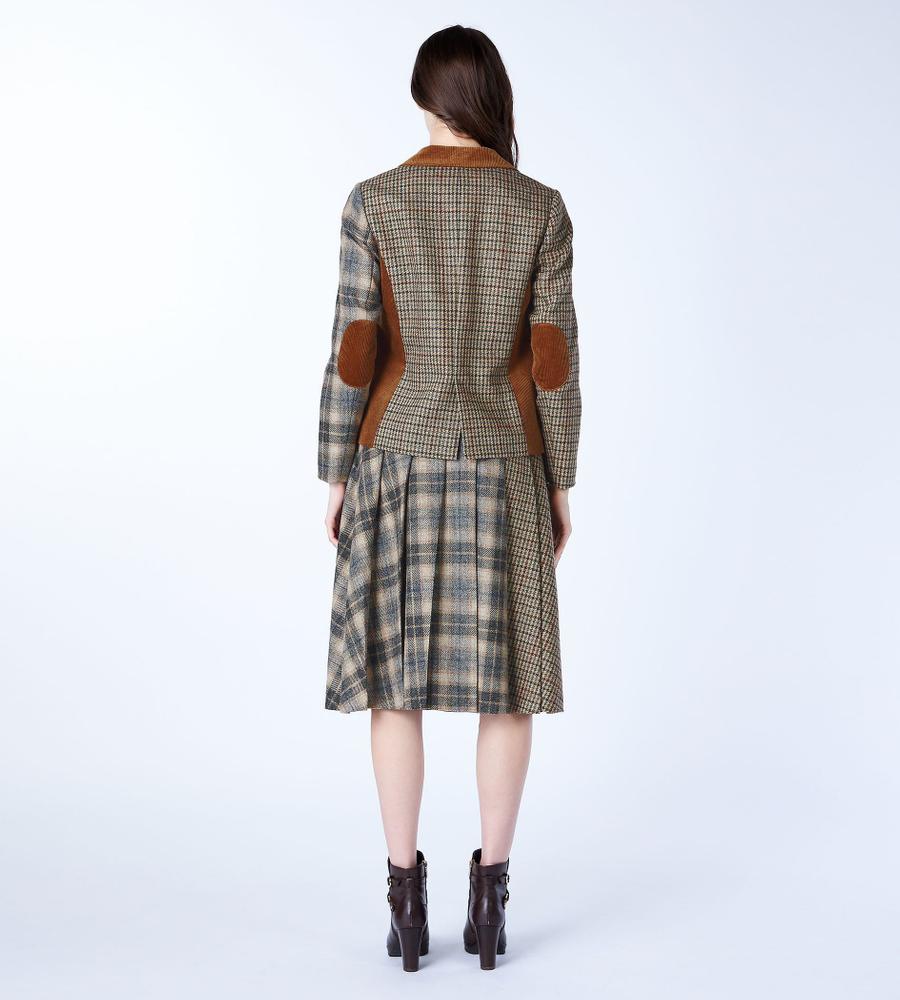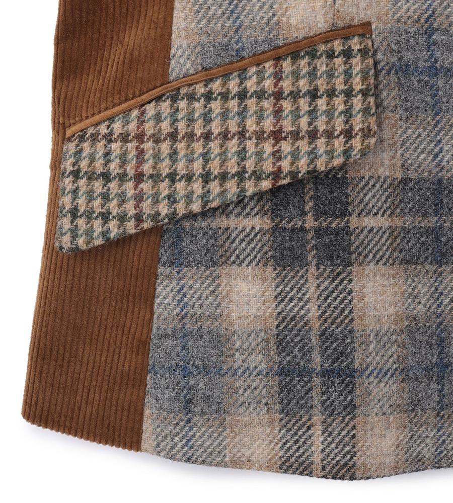 異素材で切り替えた、クレイジーパターンのテーラードジャケットです。2種類のチェック柄に、暖かみのあるコーデュロイもプラスしました。腰ポケットはフラップ付きで、左胸には丸みのあるポケットをプラス。味わいのあるレザー調のボタンもポイントです。同シリーズのプリーツスカートと、セットアップで着用ができます。