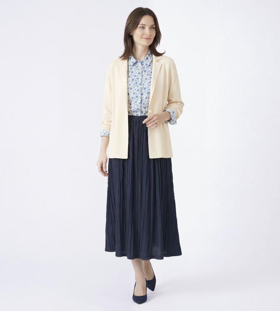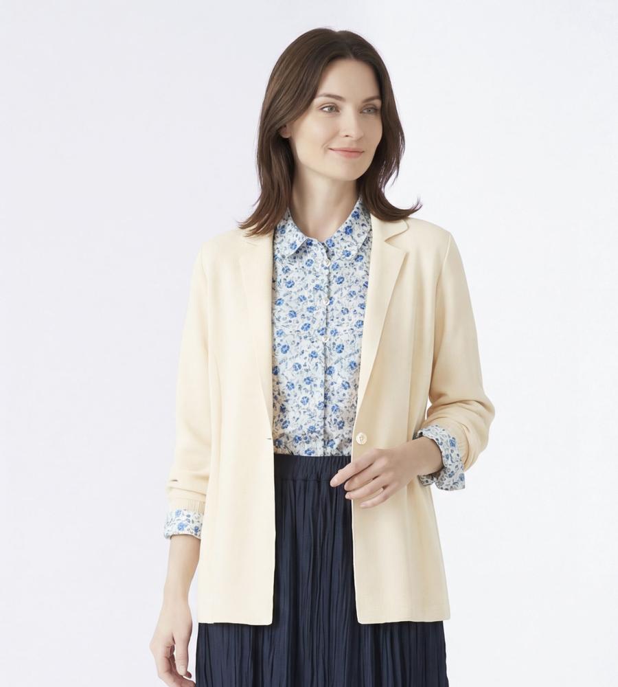 風通し良く着られる綿混ニット素材のジャケット。ゆとりのあるシルエットやワンボタンで、気負わずラフに着こなせます。脇に切り替えが入っており、ボディラインをスマートに演出できるのも心憎いポイント。