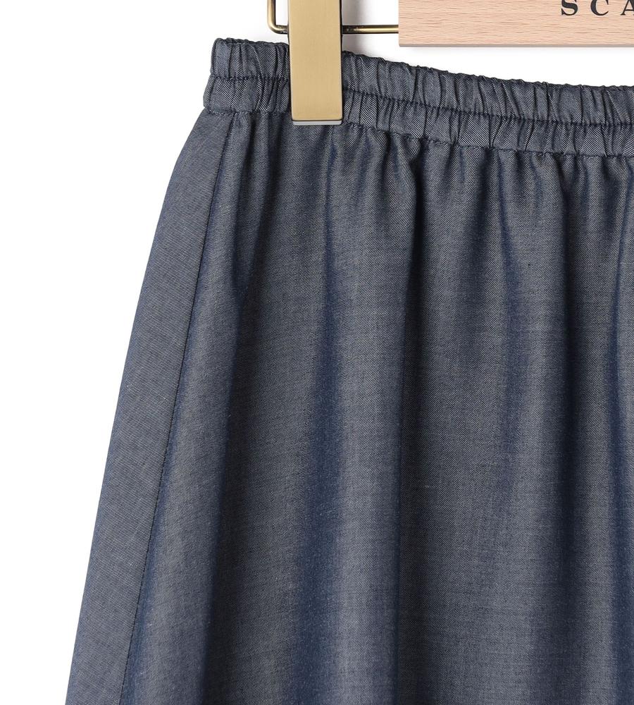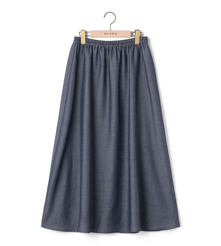 しなやかなツイル生地で仕立てたミディ丈スカート。裾に向かってフレアに広がるAライン、ドレープ感のあるシルエットがフェミニンなムード。ウエスト部分はゴム仕様で履き心地快適なのもうれしいポイント。シンプルなデザインで合わせやすく、お手持ちのトップスにマッチ。おしゃれなお出かけコーディネートが実現する一枚です。