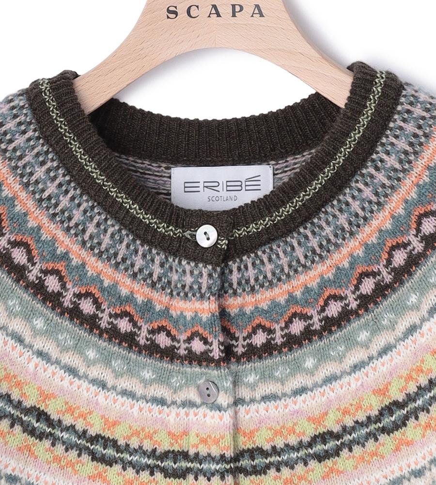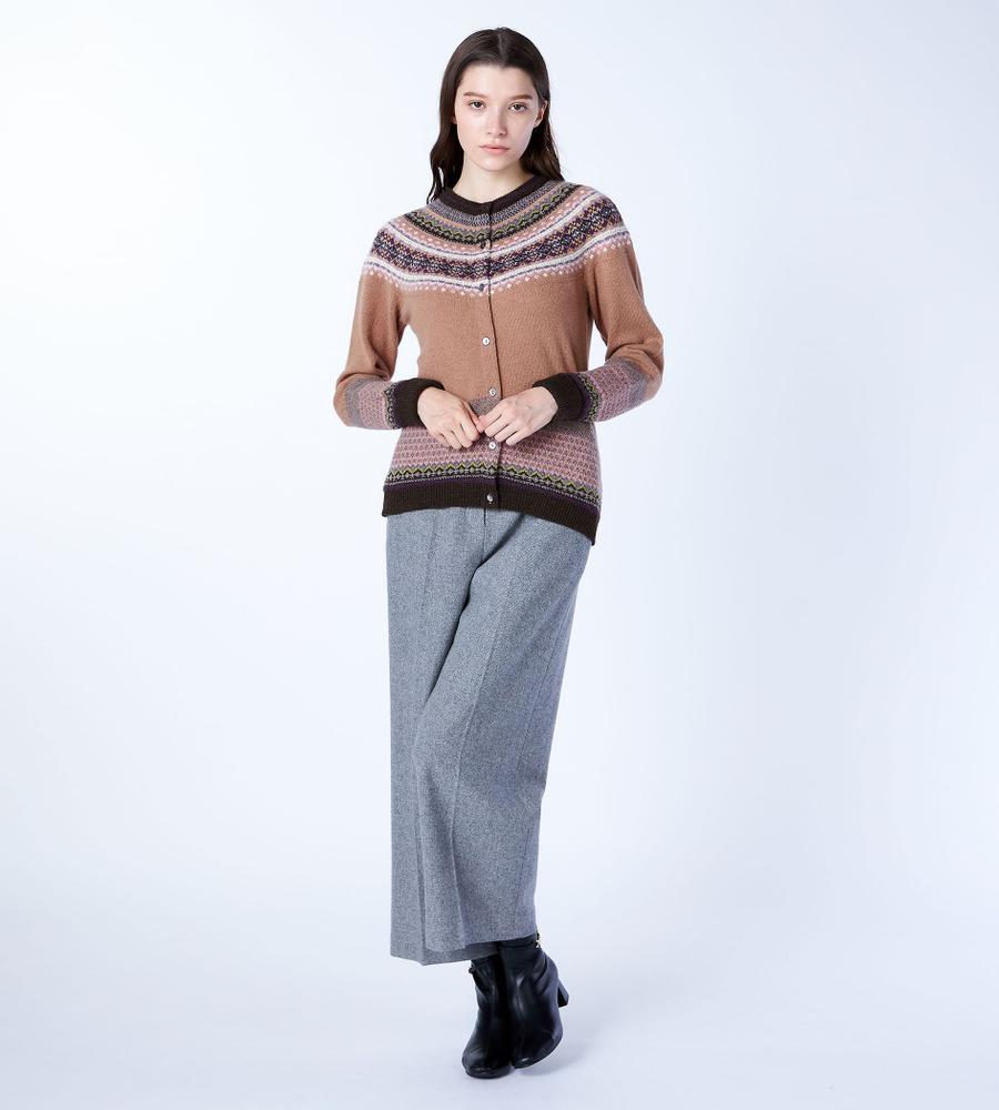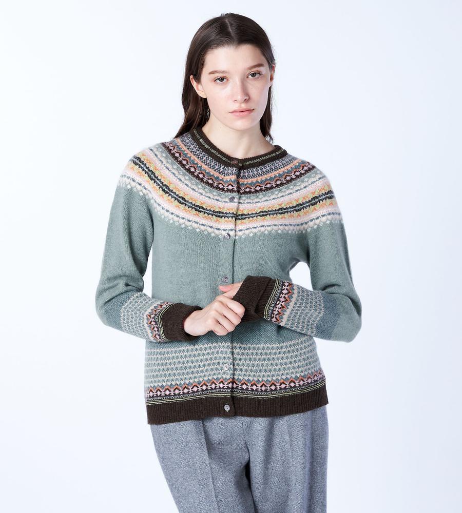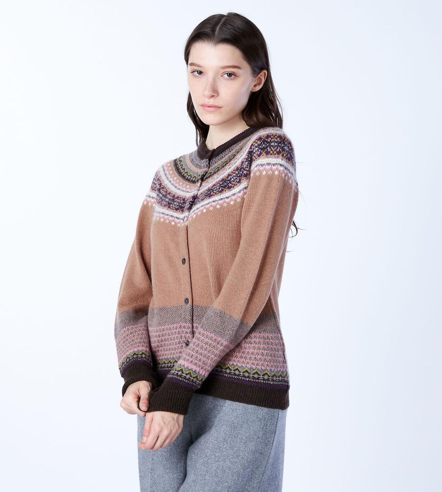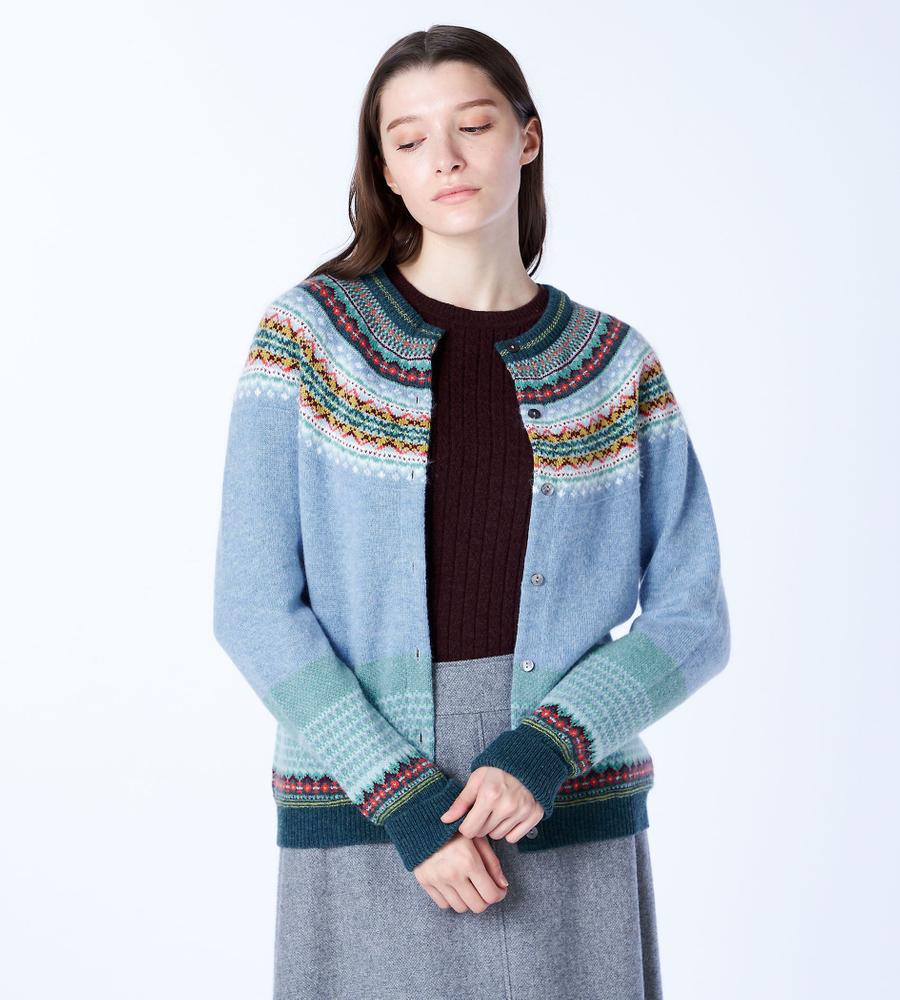 毛をふんだんに用いたニット素材のカーディガン。多彩な幾何学模様を様々な色で表現したフェアアイル調の柄使いで、秋冬らしいウォーミーな着こなしを楽しめます。裾や袖口を配色で引き締めており、賑やかながらもまとまりがあるのも特徴。ネックラインが程良く詰まっているため、1枚使いでも着映えするアイテムです。