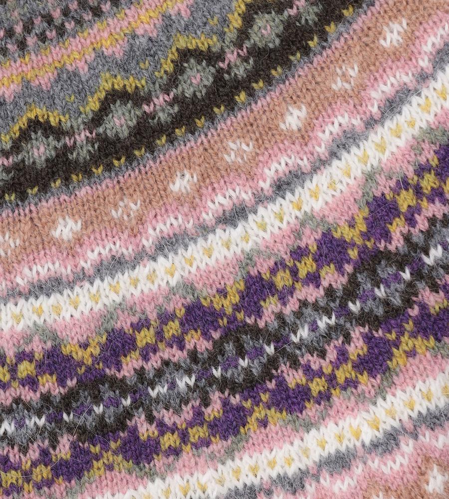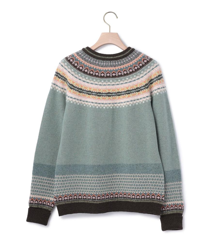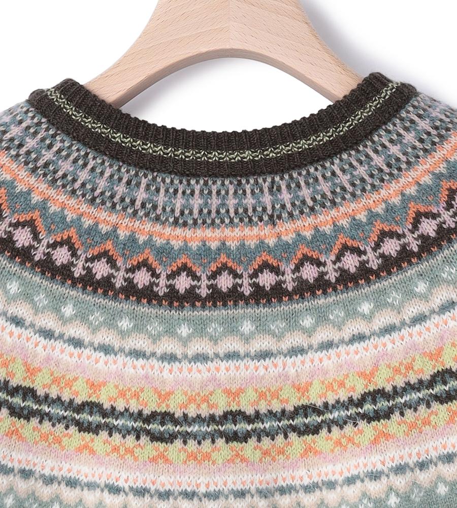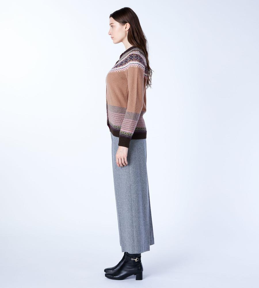 毛をふんだんに用いたニット素材のカーディガン。多彩な幾何学模様を様々な色で表現したフェアアイル調の柄使いで、秋冬らしいウォーミーな着こなしを楽しめます。裾や袖口を配色で引き締めており、賑やかながらもまとまりがあるのも特徴。ネックラインが程良く詰まっているため、1枚使いでも着映えするアイテムです。