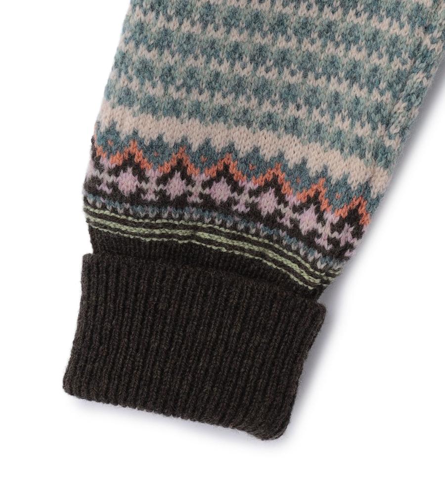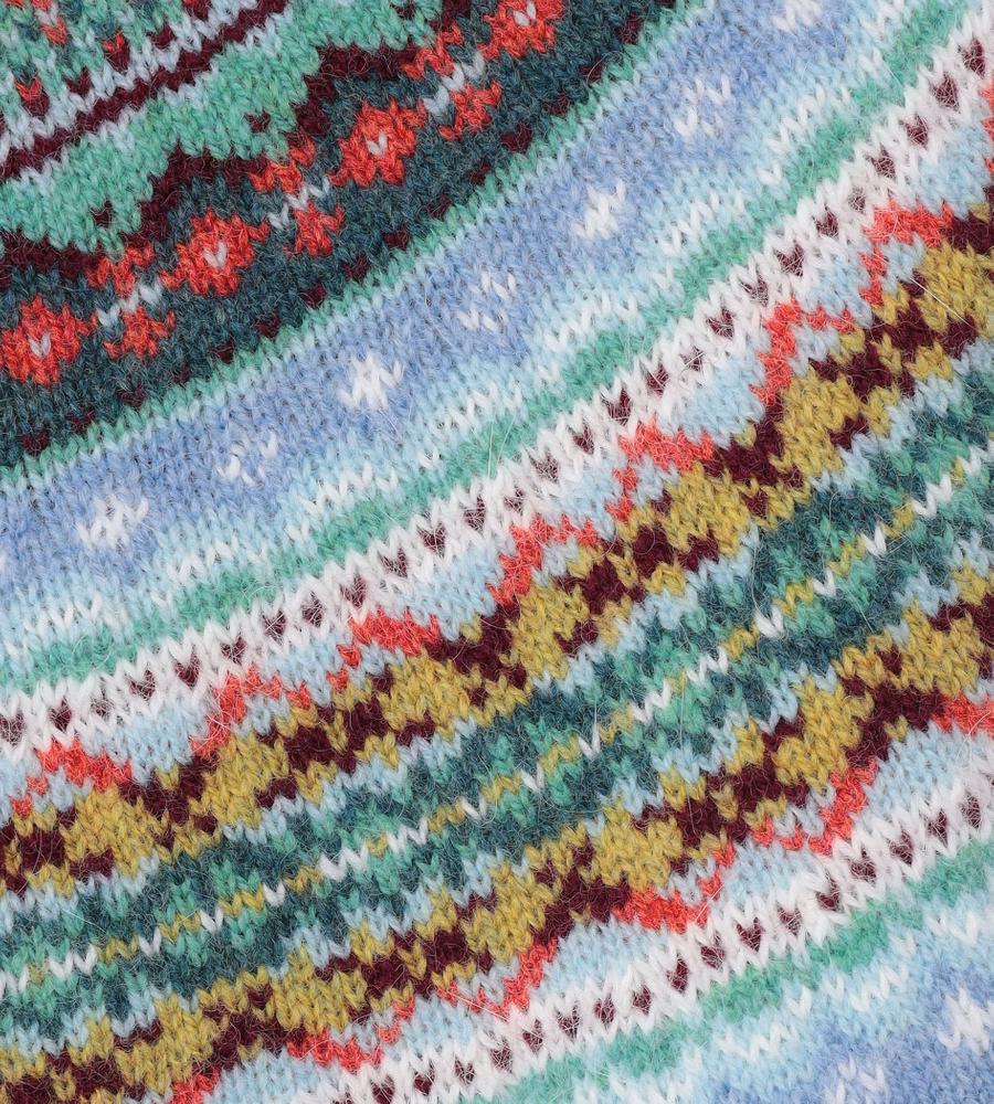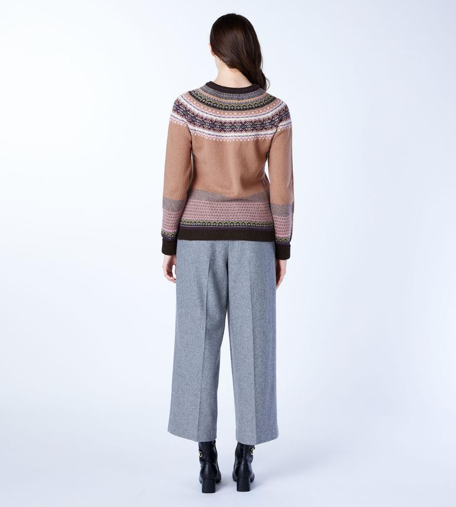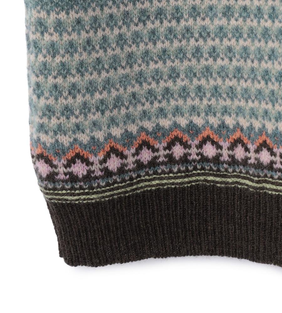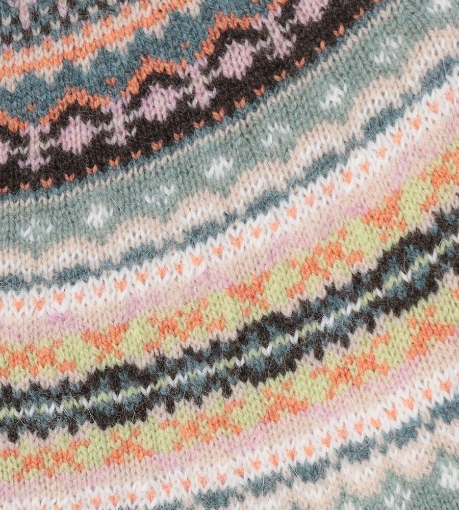 毛をふんだんに用いたニット素材のカーディガン。多彩な幾何学模様を様々な色で表現したフェアアイル調の柄使いで、秋冬らしいウォーミーな着こなしを楽しめます。裾や袖口を配色で引き締めており、賑やかながらもまとまりがあるのも特徴。ネックラインが程良く詰まっているため、1枚使いでも着映えするアイテムです。