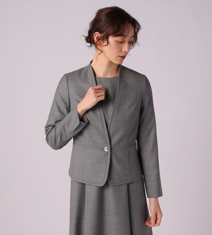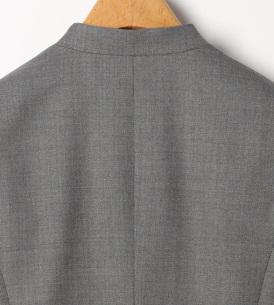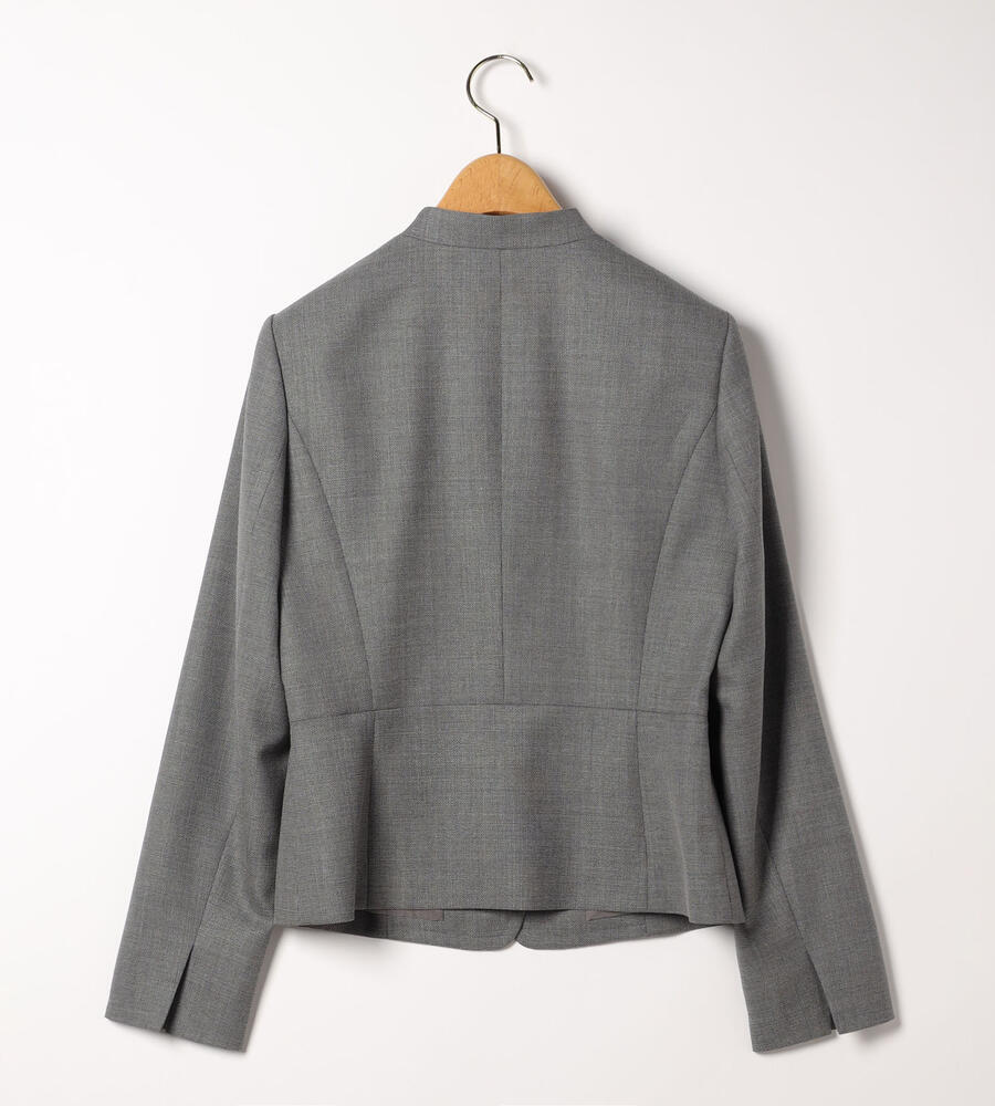 イタリア製素材を使用したジャケット。後ろ首元を立ち上げたV開きのノーカラーが、胸元に柔らかなラインを描きます。そのまま前立てを少しカーブさせ、メタルボタンをプラス。また、パネル切り替えで作る立体的なシルエットが、女性らしいウエストシェイプを実現しています。袖口は折り返し可能なスリット入り。