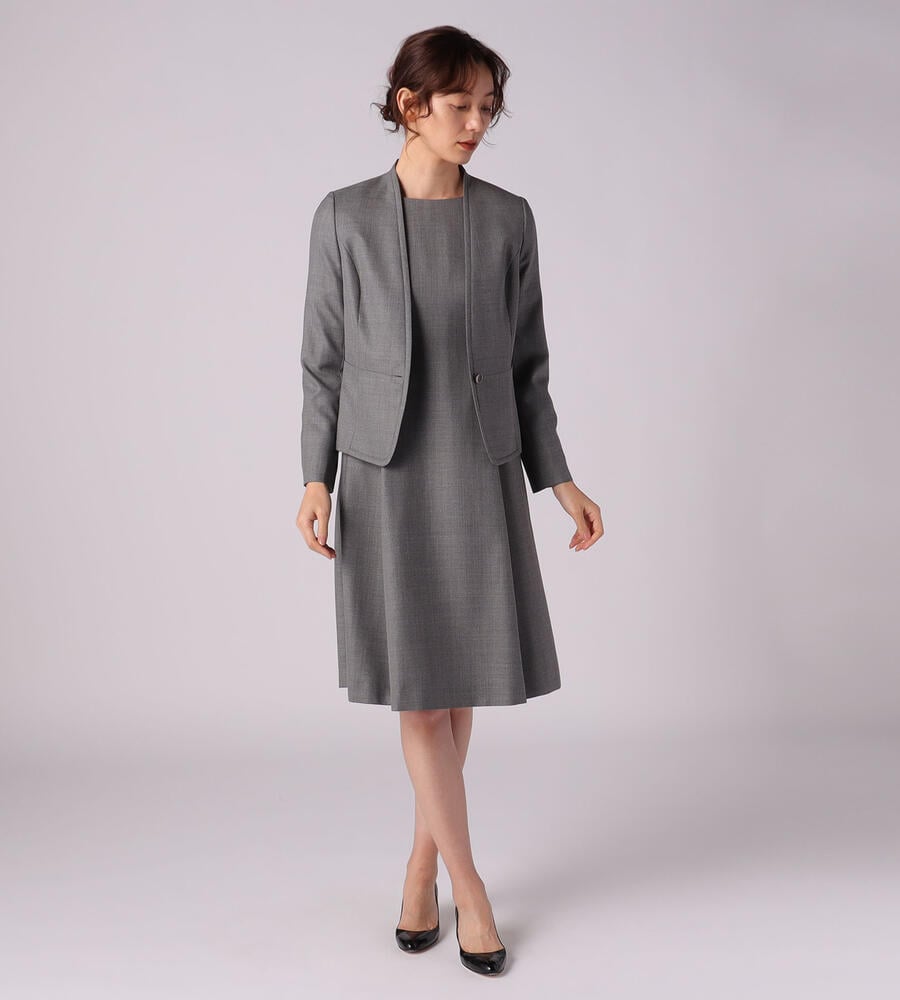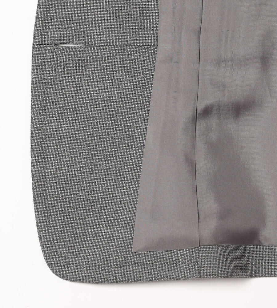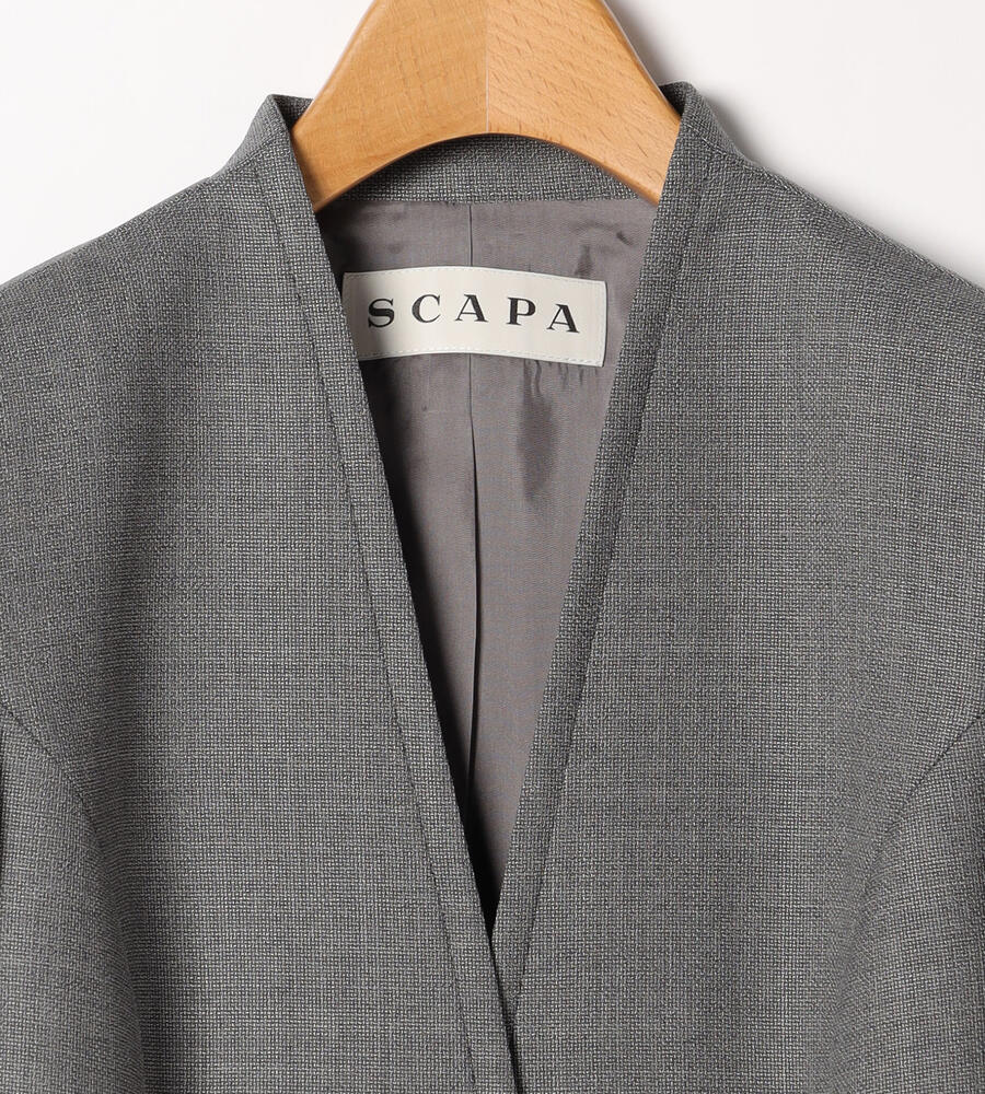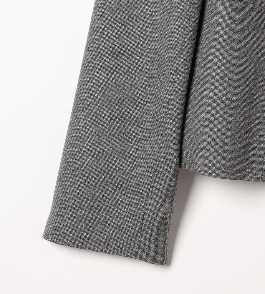 イタリア製素材を使用したジャケット。後ろ首元を立ち上げたV開きのノーカラーが、胸元に柔らかなラインを描きます。そのまま前立てを少しカーブさせ、メタルボタンをプラス。また、パネル切り替えで作る立体的なシルエットが、女性らしいウエストシェイプを実現しています。袖口は折り返し可能なスリット入り。