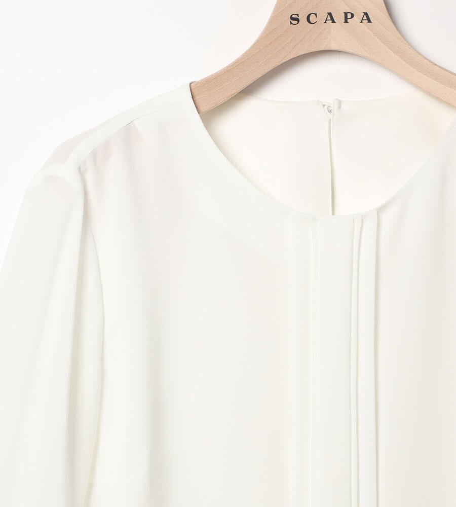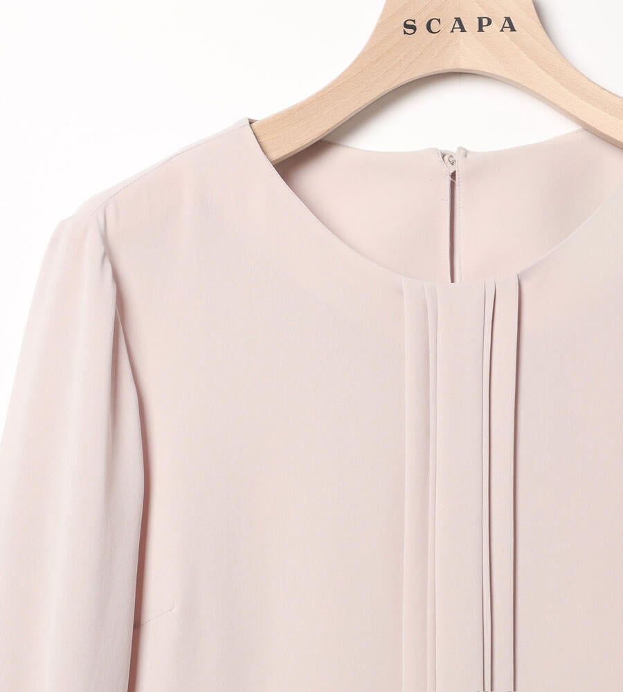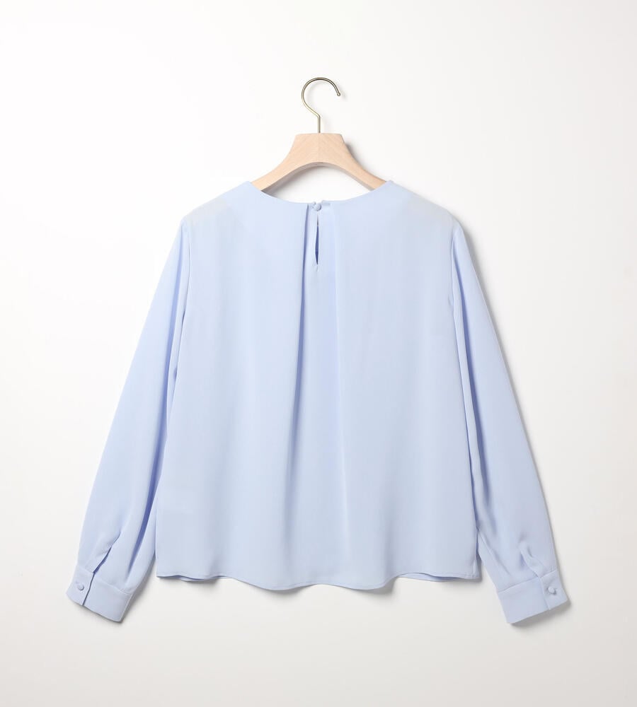 しなやかでやわらかな風合いのソフトツイル生地で仕立てた長袖ブラウス。透け感のある生地で軽やかな重ね着コーディネートが完成します。コロンとした愛らしいくるみボタン、ドレープ感が美しいタック入りのバックシルエットもポイント。きちんと感のあるデザインで、オン・オフ問わず幅広く活躍するアイテムです。